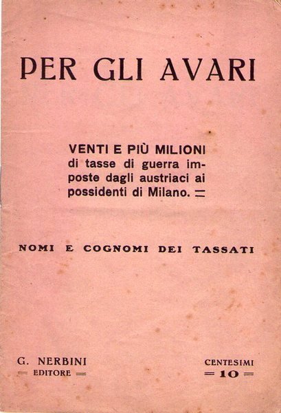 Per gli avari. Venti e più milioni di tasse di guerra imposte dagli austriaci ai possidenti di Milano. Nomi e cognomi dei tassati.