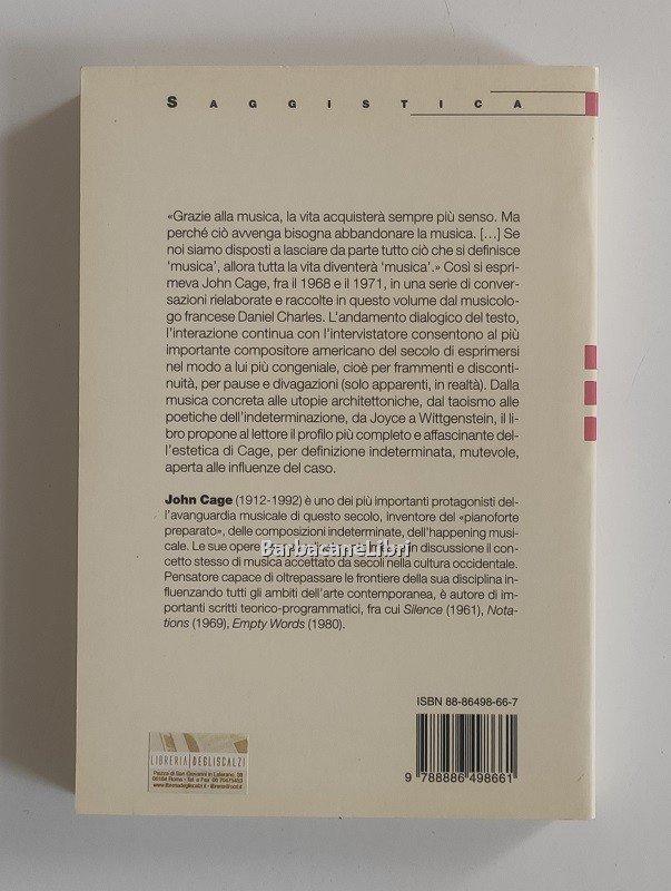 «Grazie alla musica, la vita acquisterà sempre più senso. Ma perché ciò avvenga bisogna abbandonare la musica. [...] Se noi siamo disposti a lasciare da parte tutto ciò che si definisce "musica", allora tutta la vita diventerà "musica".» Così si esprimeva John Cage, fra il 1968 e il 1971, in una serie di conversazioni rielaborate e raccolte in questo volume dal musicologo francese Daniel Charles. L'andamento dialogico del testo, l'interazione continua con l'intervistatore consentono al più importante compositore americano del secolo di esprimersi nel modo a lui più congeniale, cioè per frammenti e discontinuità, per pause e divagazioni (solo apparenti, in realtà). Dalla musica concreta alle utopie architettoniche, dal taoismo alle poetiche dell'indeterminazione, da Joyce a Wittgenstein, il libro propone al lettore il profilo più completo e affascinante dell'estetica di Cage, per definizione indeterminata, mutevole, aperta alle influenze del caso.