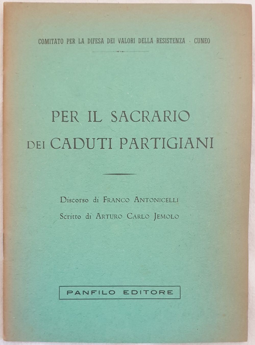 Interessante pubblicazione del 1951 sul sacrario dei caduti partigiani scritta da Franco Antonicelli (1902-1974) a cura del Comitato per la difesa dei valori della Resistenza di Cuneo. Discorso di Franco Antonicelli, scritto di Arturo Carlo Jemolo. In buone condizioni. Copertina editoriale in buone condizioni generali con lievi usure ai margini e dorso. Legatura in buone condizioni. Pagine in buone condizioni con rare fioriture. In 8 cm 21,5x15,5. Pp. 40. Peso Kg. 0,038 interesting pamhplet of 1951 about resistenza written by Franco Antonicelli (1902-1974) by the Comitatoper la difesa dei valori della Resistenza in Cuneo. Speech by Franco Antonicelli, writing by Arturo Carlo Jemolo. In good conditions. Editorial cover in good general conditions lightly worn in the extremities. Binding in good conditions. Pages are in good conditions with occasional foxing. In 8 cm 21,5x15,5. Pp. 40. Peso Kg. 0,038