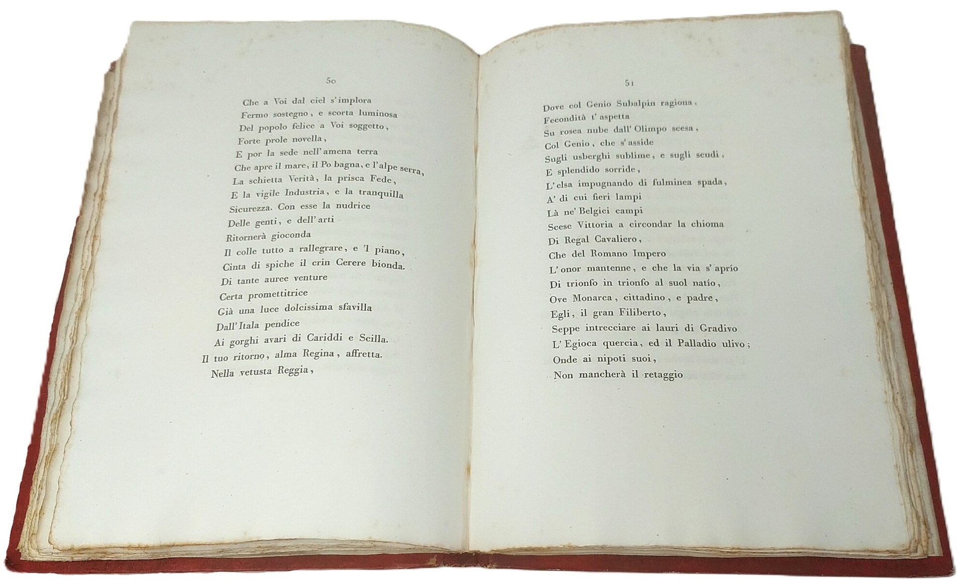 >in-4, pp. 97, sul front., monogramma calcogr. con corona di fiori e iniziali intrecciate (MT). Legatura coeva in cartonato alla bodoniana color granata, riquadri a filetto oro sui piatti, tit. ms. su tassello cartaceo al dorso. Componimenti celebrativi in vario metro di diversi autori, tra cui Giuseppe Biamonti, Prospero Balbo, Diodata Saluzzo Roero e Galeani Napione. Un'ode è in inglese, con libera traduzione italiana. Unica edizione, impressa su carta grande e greve. Freschissimo esemplare , intonso e a pieni margini. Il volume celebrativo riguarda Maria Teresa d'Austria Este, sposa di Vittorio Emanuele I di Savoia, di ritorno dalla Sardegna ai propri antichi domini il 20 maggio 1814. Raro. A