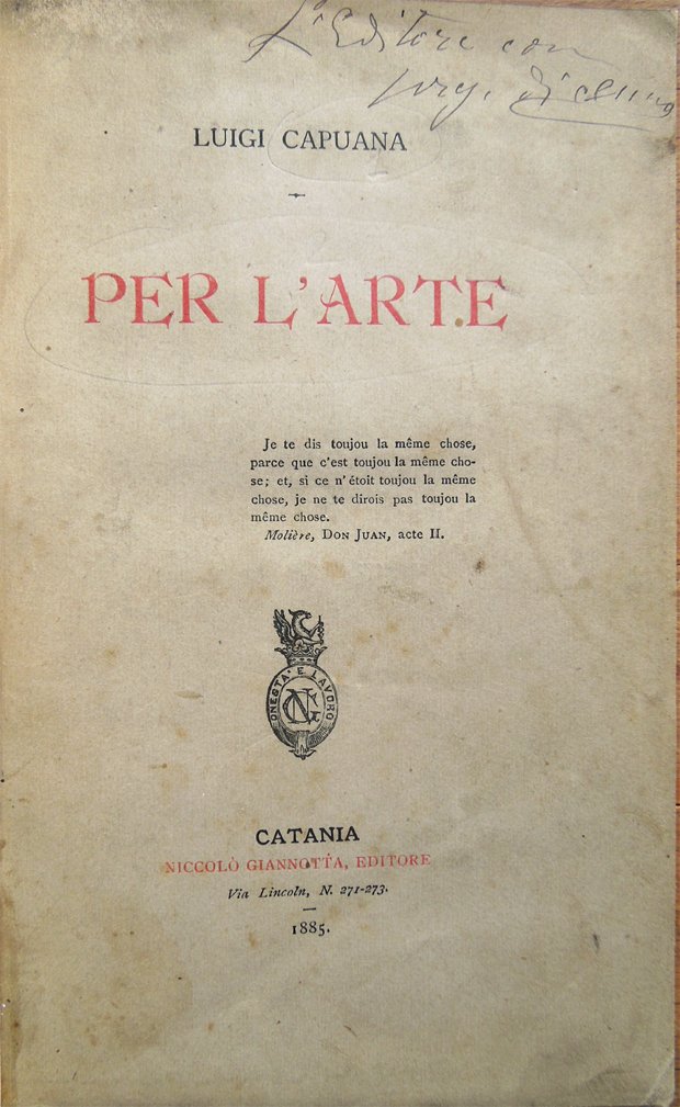 In-16° (18,8 x 12 cm), pp. (2), LXI, (3), 223, (5), legatura moderna in mezza tela con titoli su tassello al dorso. Manca l'occhietto. Conservate le copertine originali. Invio dell'editore alla copertina anteriore; due piccole immagini in bianco e nero applicate da vecchio proprietario una nella parte bianca di p. 223 (di 3,5 x 5 cm) e una alla pagina bianca posta prima dell'indice (di 3 x 7 cm). Edizione originale. Il saggio Per l'arte viene considerato il manifesto del verismo: in esso Capuana illustra le sue teorie letterarie, configurando i principi del nuovo romanzo; la riduzione della vita italiana a materia d'arte, vita ritratta direttamente dal vero, l'abbandono del romanzo storico per il romanzo di costume contemporaneo, la trattazione di temi provinciali con protagonisti personaggi presi dagli strati umili della società. Indice: Per l'Arte; I Promessi Sposi; Interpretazioni artistiche; Gabriele D'Annunzio; Medaglioni; L'eterno femminino; Alphonse Daudet; Torquemada; La moglie di Claudio; Un romanzo giapponese; Felice Romani; Giuseppe Macherione; Bernardo Celentano; Un poeta danese; Trucioli.