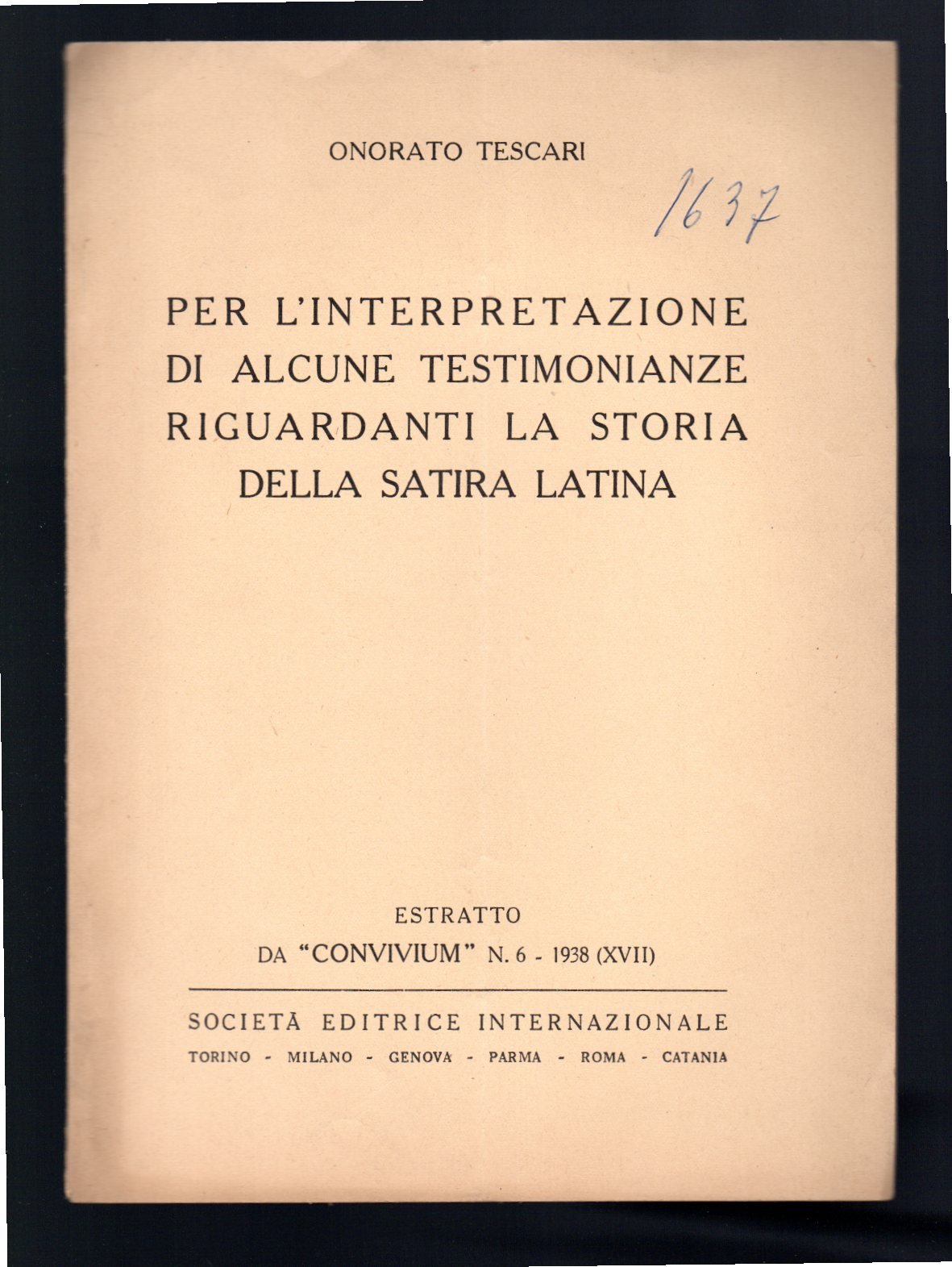 Opuscolo vintage. Estratto da "Convivium" n. 6 - 1938. Segni di biro in copertina. Piega centrale. Ordinario segno del tempo.