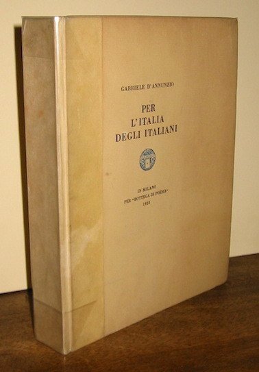 8vo (cm. 24,7), XII-(4)427(1) pp. Legatura editoriale in mz. pergamena. Al piatto anteriore titoli in nero e impresa in blu ‘Fatica senza fatica’. Al piatto posteriore l’impresa in blu ‘Ardoris rogus’. Ottimo esemplare (n. 202) della edizione rara in 600 copie su carta verghettata finissima, numerati a macchina con cifre arabe dall’uno al seicento. Guabello, 276; Vecchioni, 72c.