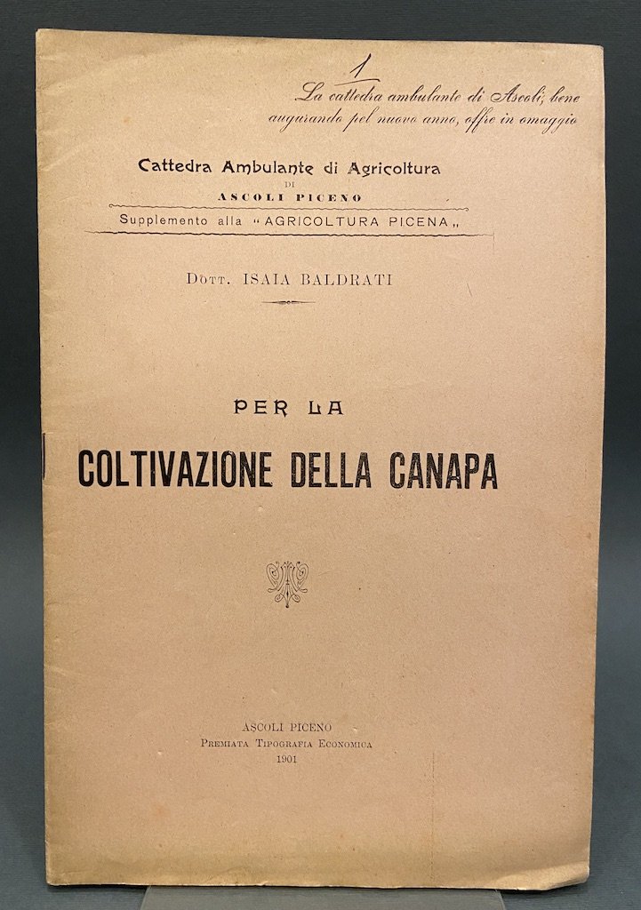Spillato in brossura, cm 24x15.5, pp 22 (2), 4 figure in nero nel testo. Pubblicazione della Cattedra Ambulante di Agricoltura di Ascoli Piceno, supplemento di Agricoltura Picena. Isaia Baldrati, botanico e agronomo, fu direttore della quale Baldrati fu primo direttore della Cattedra Ambulante di Agricoltura di Ascoli Piceno, poi a Ravenna, all'Istituto Agricolo Coloniale di Firenze; in Eritrea fu nelle amministrazioni di Ferdinando Martini e Giusepep Salvago Raggi, effettuò ricerche in campo botanico e agronomico e contribui all'organizzazione delle esposizioni coloniali di Martini.