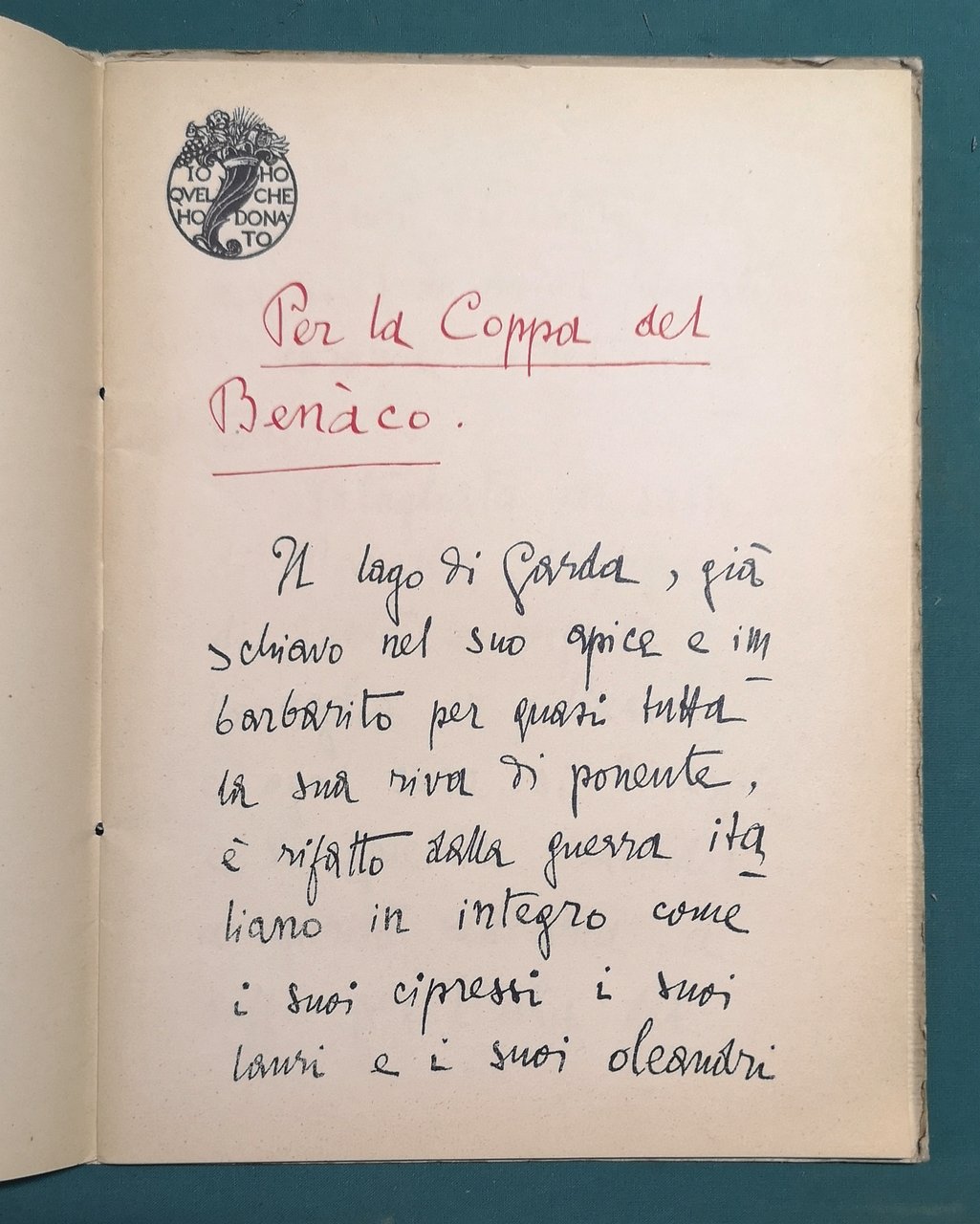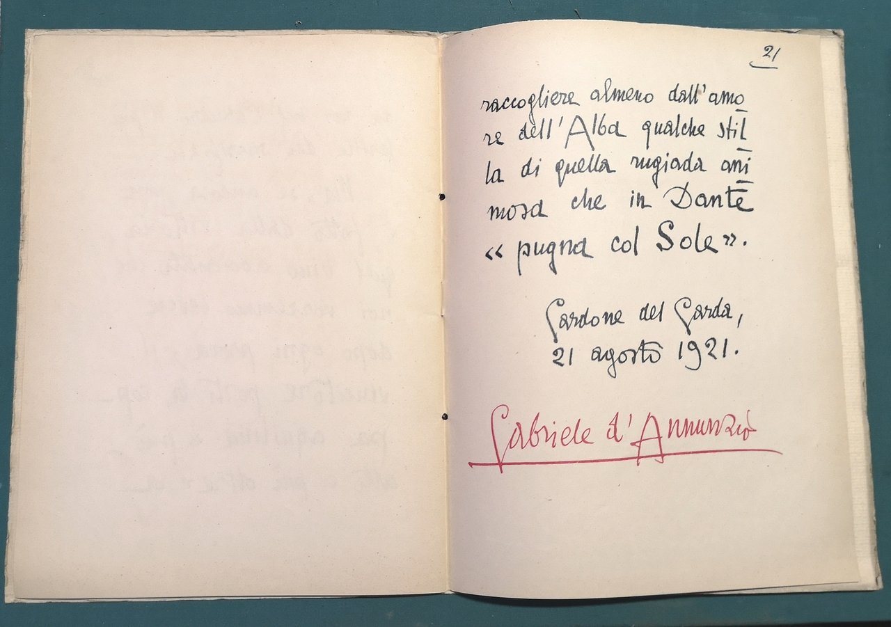 >in-4, ff. (2), 21 impressi al solo recto. Cart. editoriale figurato ai piatti dal pittore Guido Marussig. Edizione originale in facsimile del testo autografo di D'Annunzio, impressa in esemplari numerati a mano (ns. 206), senza indicazioni sulla tiratura. Perfetto esemplare. Guabello, 307. De Medici, 111.