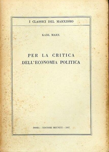 225 p. ; 22 x 15 cm. I classici del marxismo, 38. Per la critica dell'economia politica è un saggio economico, anticipatore de Il Capitale, concernente l'analisi del capitalismo e della teoria quantitativa della moneta, pubblicato nel 1859 da Karl Marx. La critica considera questo libro indispensabile per la totale comprensione delle teorie marxiste sulla crisi strutturale del capitalismo. Traduzione di Emma Cantimori Mezzomonti. Brossura editoriale, coperta in cartoncino flessibile di colore marrone con alette. Titolo impresso in nero al piatto e al dorso. Lievi segni del tempo alla coperta, al taglio e alle pagine interne (fioriture e ingiallimento della carta), per il resto libro intonso, fogli chiusi. Codice libreria 6178.