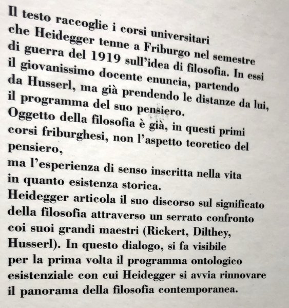 Il testo raccoglie i corsi universitari che Heidegger tenne a Friburgo nel semestre di guerra del 1919 sull'idea di filosofia. In essi il giovanissimo docente enuncia, partendo da Husserl, ma già prendendo le distanze da lui, il programma del suo pensiero. Oggetto della filosofia è già, in questi primi corsi friburghesi, non l'aspetto teoretico del pensiero, ma l'esperienza di senso inscritta nella vita in quanto esistenza storica. Heidegger articola il suo discorso sul significato della filosofia attraverso un serrato confronto coi suoi grandi maestri (Rickert, Dilthey, Husserl). In questo dialogo, si fa visibile per la prima volta il programma ontologico esistenziale con cui Heidegger si avvia rinnovare il panorama della filosofia contemporanea.