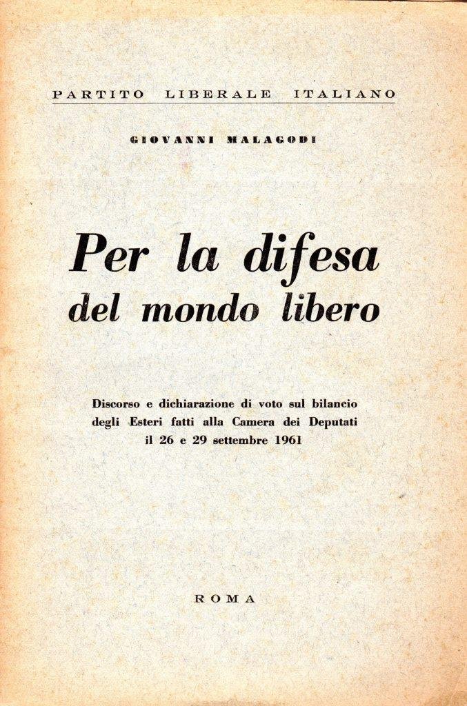Per la difesa del mondo libero, senza data, pp. 51, formato 14 x 20,5.<BR>Copertina morbida di colore grigio con titoli in nero al piatto anteriore. Discorso e dichiarazione di voto sul bilancio degli Esteri fatti alla Camera dei Deputati il 26 e 29 settembre 1961. <BR>Leggero ingiallimento dei piatti dovuto al tempo. Nel complesso ottime condizioni.