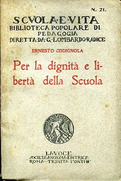 In-16°, pp. 130, (6), brossura editoriale con logo de La Voce. Qualche sottolineatura, ma bell'esemplare in barbe. Prima edizione. Scuola e Vita. Biblioteca Popolare di Pedagogia diretta da G. Lombardo Radice, n. 21.