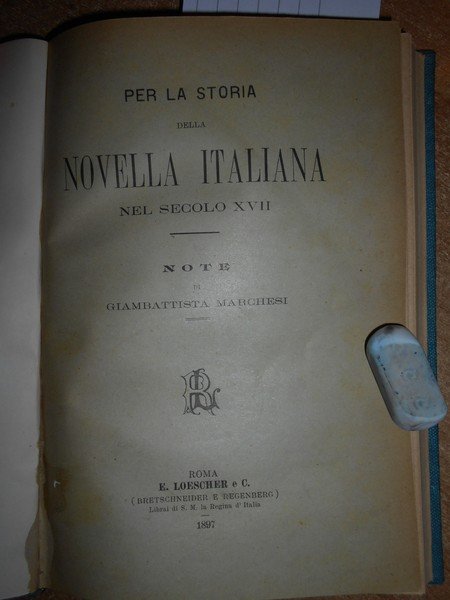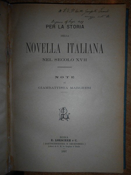 PER LA STORIA DELLA NOVELLA ITALIANA NEL SECOLO XVII. NOTE. IN-8° PICCOLO, TELA CON TITOLO IN ORO ENTRO TASSELLO AL DORSO, COPERTINE ORIGINALI CONSERVATE. (3), 213, (5) PP. OTTIMO ESEMPLARE IN LEGATURA RECENTE CON LE COPERTINE ORIGINALI CONSERVATA E UNA DEDICA DELL' AUTORE NEL FRONTESPIZIO. UFF. A - I - 1