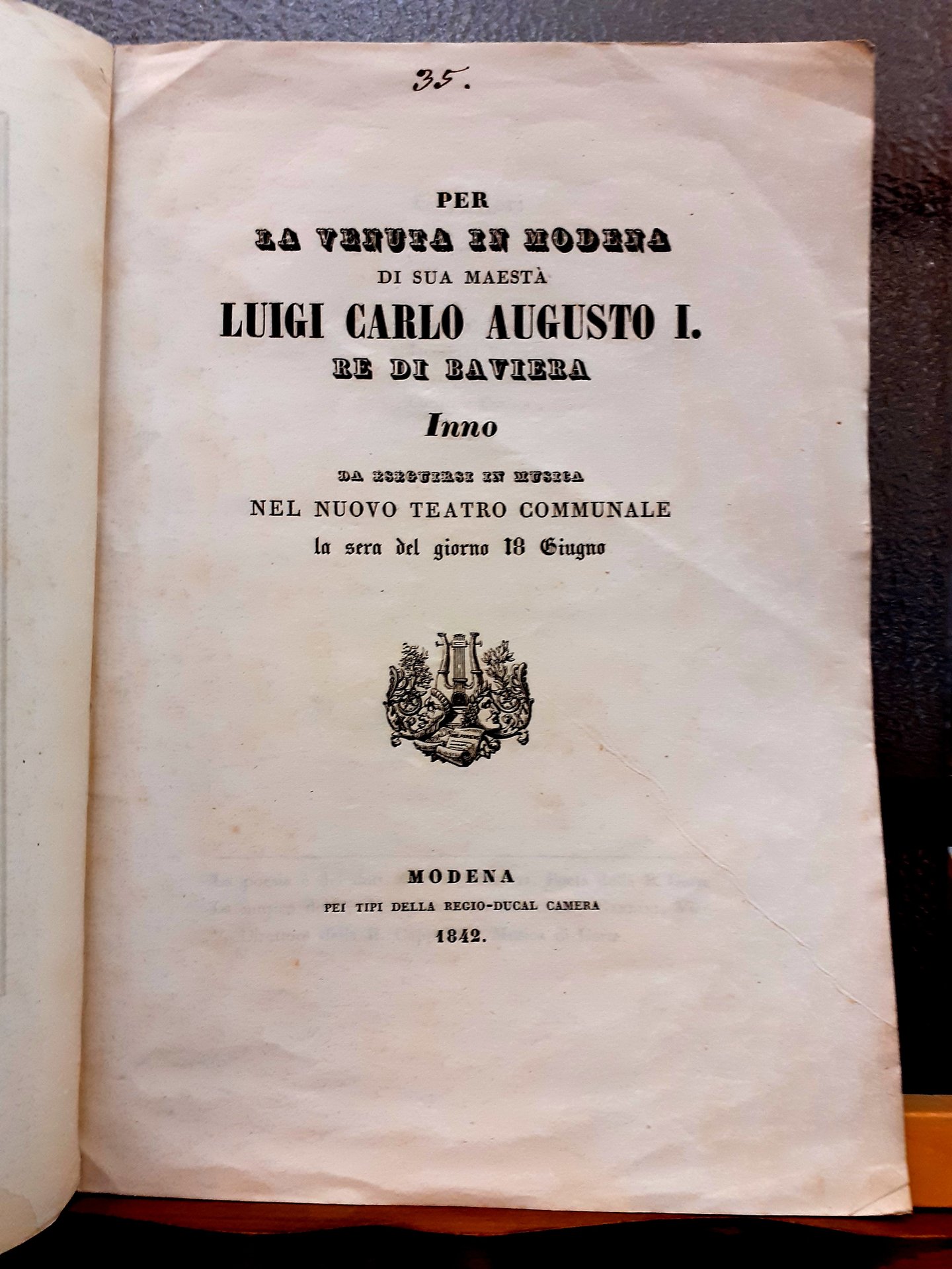 PER LA VENUTA IN MODENA DI SUA MAESTA' LUIGI CARLO AUGUSTO I RE DI BAVIERA: INNO da eseguire in musica NEL NUOVO TEATRO COMUNALE LA SERA DEL GIORNO 18 GIUGNO.