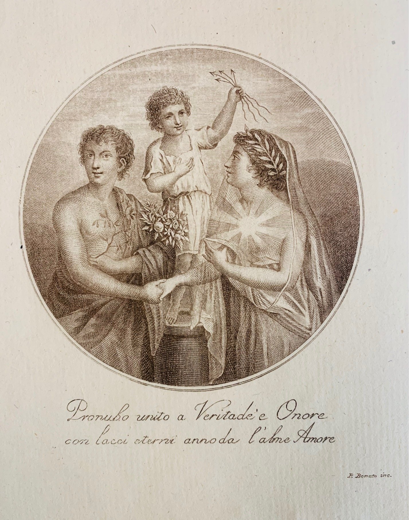 >in-4 (mm. 320x230), pp (2 con antiporta inciso in rame), 27, (1), cartonato decorato coevo. In antiporta l'incisione firmata "F Bonati" raffigurante i due sposi, nella parte inferiore è presente il motto: Pronubo unito a veritade e Onore/con lacci eterni annoda l'alme amore. Girolamo Polcastro (1763-1839) il 14 settembre 1795 sposò, per volere del padre, la ventunenne Caterina Papafava, figlia del conte Giacomo, stringendo così i propri legami con una famiglia discendente dai Carraresi. Già da alcuni anni infatti egli era un habitué del salotto della futura suocera, la nobildonna friulana Arpalice Brazzà, punto di riferimento mondano dell'élite padovana, frequentato da Giovanni e Girolamo Lazara, Girolamo Da Rio, Antonio Vigodarzere, Francesco Scipione Dondi dall'Orologio, Melchiorre Cesarotti, Giuseppe Greatti, Luigi Mabil e Simone Stratico.