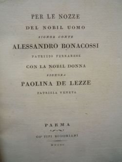 Per le nozze del nobil uomo signor conte Alessandro Bonacossi patrizio ferrarese con la nobil donna signora Paolina De Lezze patrizia veneta.