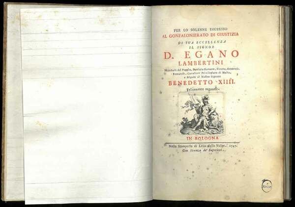 Per lo solenne ingresso al Gonfalonierato di Giustizia si sua Eccellenza il Signor D. Egano Lambertini Marchese del Poggio, Patrizio romano, Veneto Genovese, Ferrarese, Cavaliere privilegiato di Malta, e nipote di Nostro Signore Benedetto XIIII Felicement