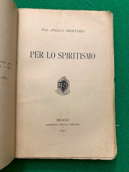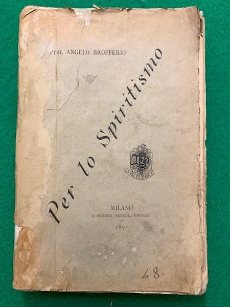 In 8° grande; (2), IX, (1), 336, (4) pp. Brossura editoriale, piatto anteriore e posteriore, dorso rinforzato. Antica collocazione in collezione privata al recto del piatto anteriore. All'interno in buone condizioni di conservazione. Prima edizione di questa interessante opera dedicata allo spiritismo, scritto dal noto poeta, politico e drammaturgo piemontese, Angelo Brofferio (Castelnuovo Calcea, 6 dicembre 1802 – Minusio, 25 maggio 1866). Nell'opera Brofferio che come noto prese parte a diverse sedute spiritiche organizzate da alcuni dei più celebri medium dell'eopca, cerca di dimostrare la realtà dei fenomeni spiritici. Prima edizione.