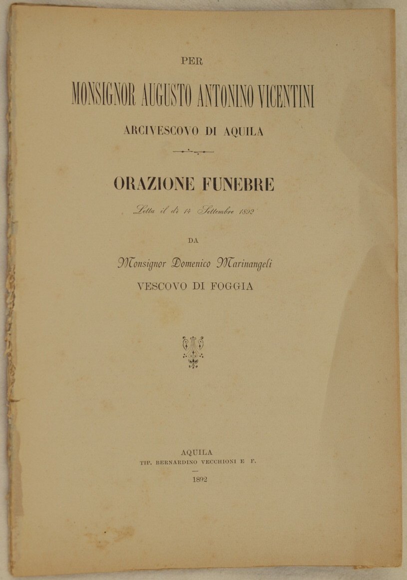 In 8. Dim. 24x16,5 cm. Pp. 46. Interessante pubblicazione del 1892, un orazione funebre per la morte di Monsignor Augusto Antonino Vicentini Arcivescovo di Aquila letta il 14 settembre 1892 da Domenico Marinangeli Vescovo di Foggia.<BR>In buone condizioni. Copertina assente. Legatura quasi assente. All'interno le pagine si presentano in buone condizioni con rare fioriture. Interesting pamphlet of 1892, a funeral oration for the death of Monsignor Augusto Antonino Vicentini Archibyshop of Aquila read the 14th of september 1892 by Domenico Marinangeli Byshop of Foggia. In good conditions. Cover is missing. Binding is almost missing. Inside pages are in good conditions with occasional foxings.