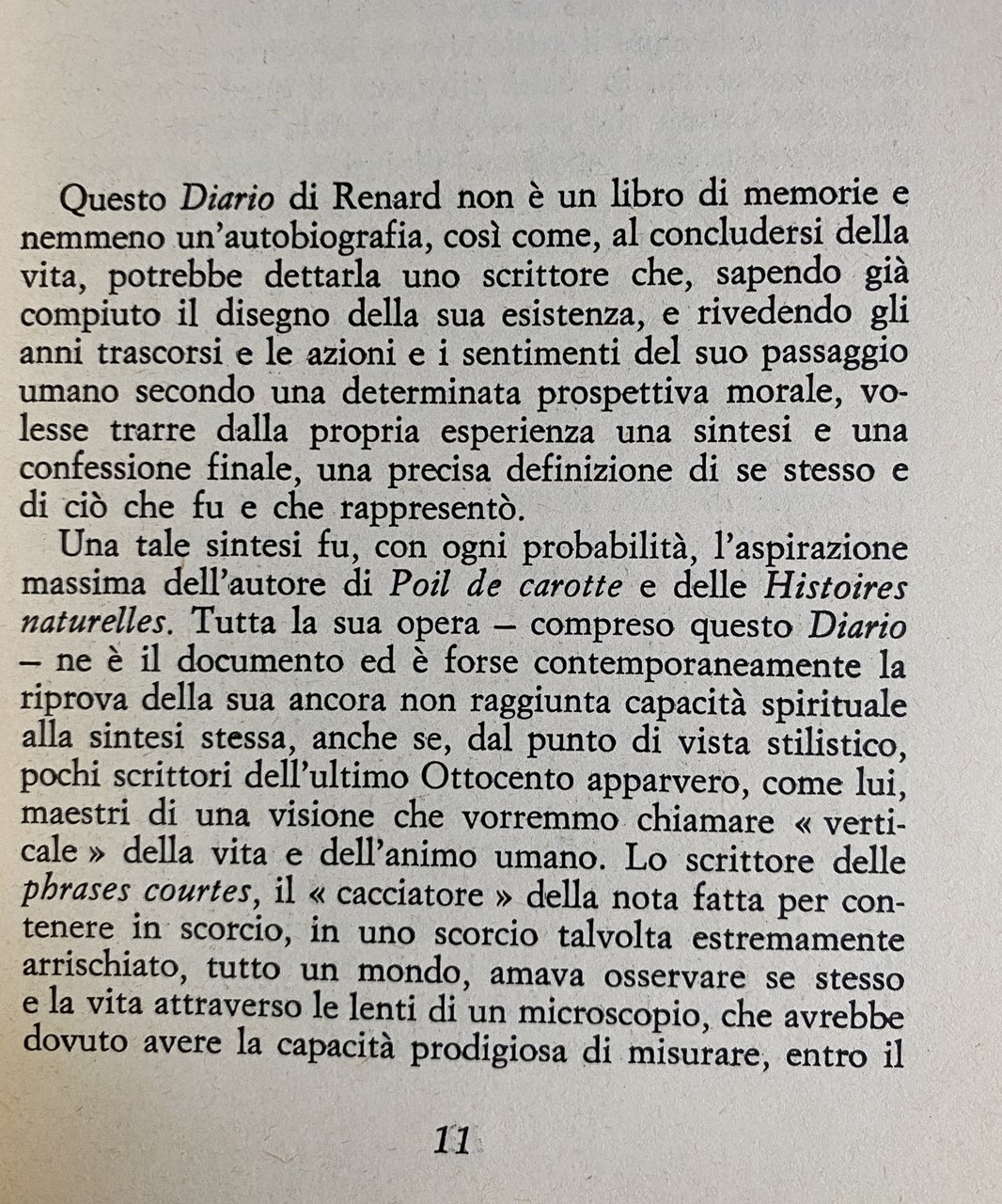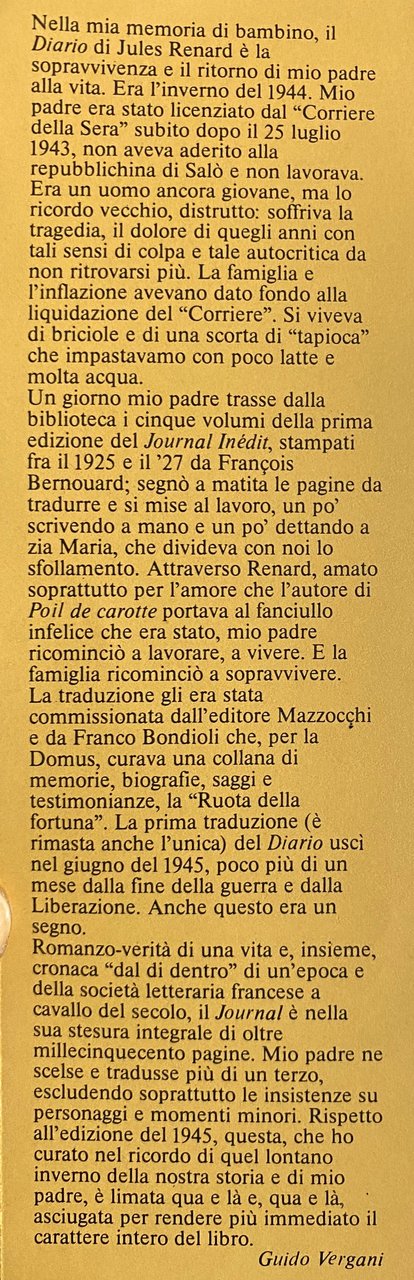 Nella mia memoria di bambino, il Diario di Jules Renard è la sopravvivenza e il ritorno di mio padre alla vita. Era l'inverno del 1944. Mio padre era stato licenziato dal Corriere della Sera subito dopo il 25 luglio 1943, non aveva aderito alla repubblichina di Salò e non lavorava. Era un uomo ancora giovane, ma lo ricordo vecchio, distrutto: soffriva la tragedia, il dolore di quegli anni con tali sensi di colpa e tale autocritica da non ritrovarsi più. La famiglia e l'inflazione avevano dato fondo alla liquidazione del "Corriere". Si viveva di briciole e di una scorta di tapioca che impastavamo con poco latte e molta acqua. Un giorno mio padre trasse dalla biblioteca i cinque volumi della prima edizione del Journal Inédit, stampati fra il 1925 e il 27 da François Bernouard; segnò a matita le pagine da tradurre e si mise al lavoro, un po' scrivendo a mano e un po' dettando a zia Maria, che divideva con noi lo sfollamento. Attraverso Renard, amato soprattutto per l'amore che l'autore di Poil de carotte portava al fanciullo infelice che era stato, mio padre ricominciò a lavorare, a vivere. E la famiglia ricominciò a sopravvivere. La traduzione gli era stata commissionata dall'editore Mazzocchi e da Franco Bondioli che, per la Domus, curava una collana di memorie, biografie, saggi e testimonianze, la Ruota della fortuna. La prima traduzione (è rimasta anche l'unica) del Diario usci nel giugno del 1945, poco più di un mese dalla fine della guerra e dalla Liberazione. Anche questo era un segno.