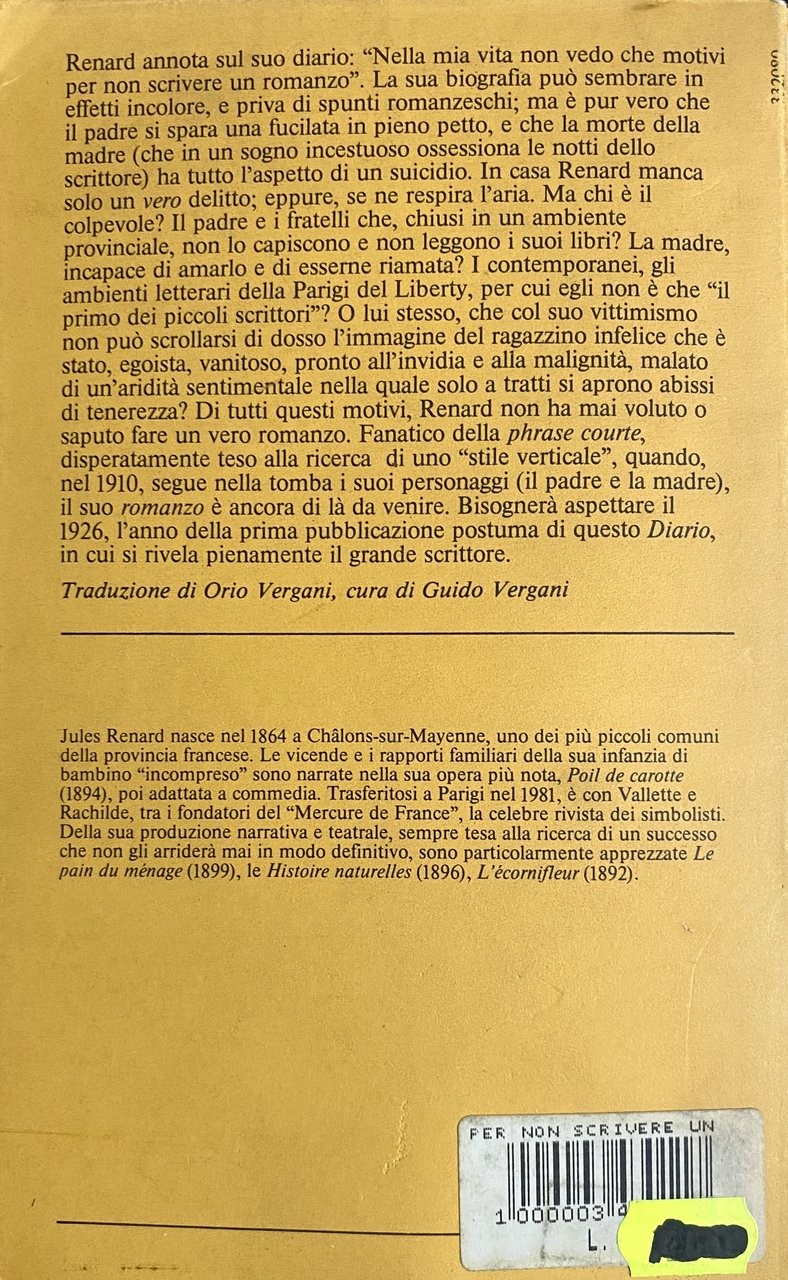Renard annota sul suo diario: "Nella mia vita non vedo che motivi per non scrivere un romanzo". La sua biografia può sembrare in effetti incolore, e priva di spunti romanzeschi; ma è pur vero che il padre si spara una fucilata in pieno petto, e che la morte della madre (che in un sogno incestuoso ossessiona le notti dello scrittore) ha tutto l'aspetto di un suicidio. In casa Renard manca solo un vero delitto; eppure, se ne respira l'aria. Ma chi è il colpevole? Il padre e i fratelli che, chiusi in un ambiente provinciale, non lo capiscono e non leggono i suoi libri? La madre, incapace di amarlo e di esserne riamata? I contemporanei, gli ambienti letterari della Parigi del Liberty, per cui egli non è che "il primo dei piccoli scrittori"? O lui stesso, che col suo vittimismo non può scrollarsi di dosso l'immagine del ragazzino infelice che è stato, egoista, vanitoso, pronto all'invidia e alla malignità, malato di un'aridità sentimentale nella quale solo a tratti si aprono abissi di tenerezza? Di tutti questi motivi, Renard non ha mai voluto o saputo fare un vero romanzo. Fanatico della phrase courte, disperatamente teso alla ricerca di uno "stile verticale", quando, nel 1910, segue nella tomba i suoi personaggi (il padre e la madre), il suo romanzo è ancora di là da venire. Bisognerà aspettare il 1926, l'anno della prima pubblicazione postuma di questo Diario, in cui si rivela pienamente il grande scrittore.