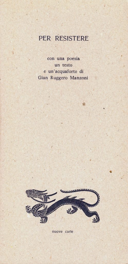 Per resistere, prima edizione dicembre 1997, formato 12 x 25.<BR>Copertina morbida di colore grigio con titoli in nero al piatto anteriore. Volume non rilegato.All'interno una poesia, un testo e un acquaforte di Gian Ruggero Manzoni.Edizione stampata in 75 esemplari numerati . Nostro n. 75.<BR>Ottime condizioni.