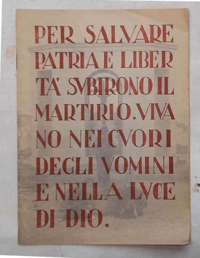 In 8° (cm. 24 x 17); pagg. 24; con numerose illustrazioni fotograf. in nero n.t.; leggera cartonatura figurata. VG-. ** Rara edizione originale. A cura del Comitato per le Onoranze ai Martiri della Libertà di Casale Monferrato. Con biografie e foto dei 32 Partigiani sepolti nella cappella-monumento nel Cimitero Civico, di sette che riposano in altre località e di uno la cui salma non è mai stata ritrovata.
