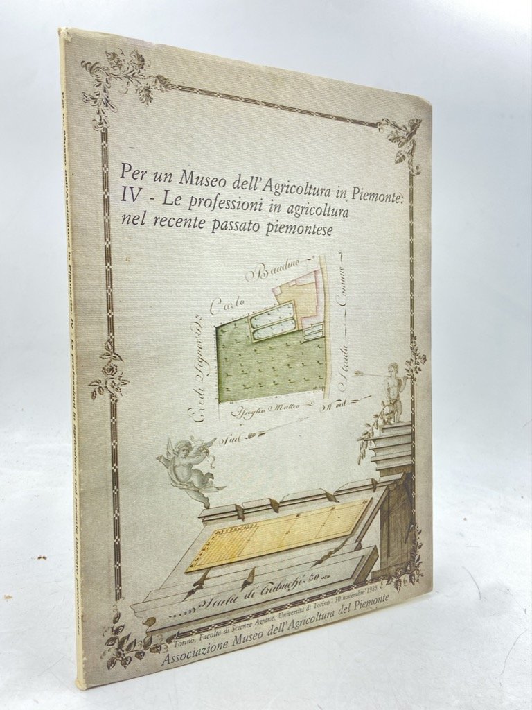 Brossura editoriale illustrata, cm 24 x 17, pp (4) 138 (2) Atti del Quarto Convegno dell’Associazione Museo dell’Agricoltura del Piemonte (Torino, 30 novembre 1985). Contiene: Alfonso Bogge, Un grande affittuario del XIX secolo: Giacinto Corio; Giuseppe Bracco, Tecnica delle rilevazioni catastali nell'età moderna; Luigi Butera, I principali artefici e realizzatori delle grandi opere di canalizzazione e irrigazione in Piemonte; Mario Caffaratto Tirsi, La funzione del medico nel mondo contadino; Cristoforo Masino, La presenza del farmacista fra la popolazione contadina in Piemonte nel secolo XIX; Giovanni Molinari, Giuseppe Chiaretta, Ruolo del veterinario nelle comunità rurali piemontesi; Agostino Tarditi, La professione dell'agronomo: origini. Le cattedre ambulanti in Piemonte; Maurizio Quagliolo, La professione di geometra; Carlo Nan, I Comizi Agrari in relazione alla propaganda agraria; Giorgio Tourn, L'opera di Edoardo Rostan, medico botanico delle Valli Valdesi; Giovanni Agagliate, L'opera del clero e dei Salesiani a favore del progresso agrario tra il XIX e il XX secolo; Enrico Chiaretta, Lorenzo Benanti, Ruolo del professionista perito agrario.