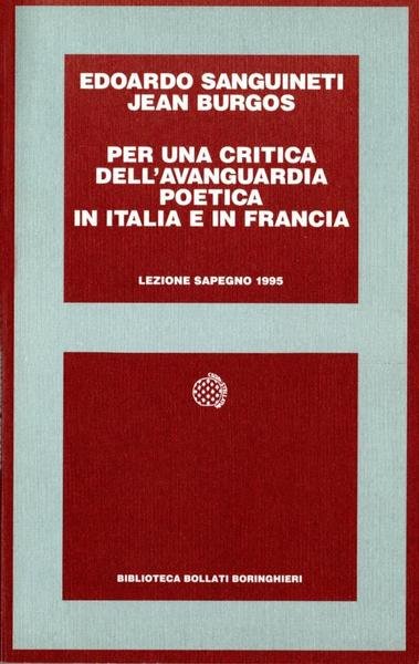 Per una critica dell'avanguardia poetica in Italia e in Francia, prima edizione dicembre 1995, pp. 80, formato 11 x 17,6.Copertina morbida marrone e celeste con titoli in bianco sul piatto anteriore e sulla costola. Traduzioni dei testi di Jean Burgos a cura di Pierangela Adinolfi. <BR>Ottime condizioni.