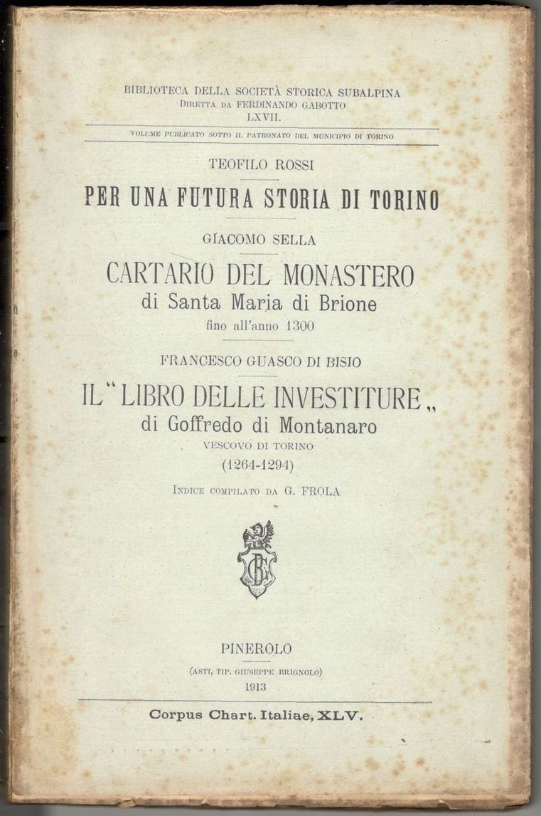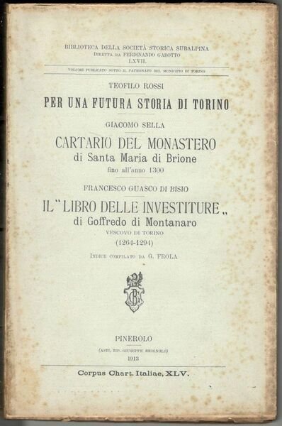 Tre opere in un volume in 8°, pp. XIX, (1), VIII, 323, (1). Brossura editoriale a stampa. Fioriture alla copertina, per il resto copia in ordine, interamente a fogli chiusi. Volume pubblicato sotto il patronato del Municipio di Torino. Biblioteca della Società Storica Subalpina LXVII. Corpus Chart. Italiae, XLV.