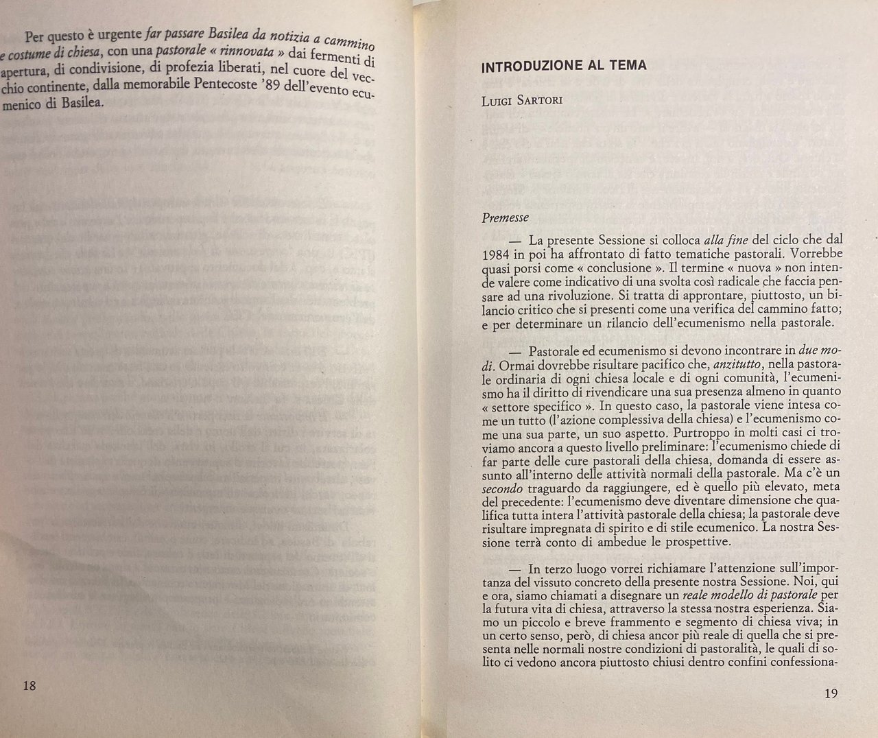 INTRODUZIONE AL TEMA. Premessa. La presente Sessione si colloca alla fine del ciclo che dal 1984 in poi ha affrontato di fatto tematiche pastorali. Vorrebbe quasi porsi come conclusione Il termine nuova non intende valere come indicativo di una svolta così radicale che faccia pensare ad una rivoluzione. Si tratta di approntare, piuttosto, un bilancio critico che si presenti come una verifica del cammino fatto; e per determinare un rilancio dell'ecumenismo nella pastorale. Pastorale ed ecumenismo si devono incontrare in due modi. Ormai dovrebbe risultare pacifico che, anzitutto, nella pastorale ordinaria di ogni chiesa locale e di ogni comunità, l'ecumenismo ha il diritto di rivendicare una sua presenza almeno in quanto settore specifico. In questo caso, la pastorale viene intesa co me un tutto (l'azione complessiva della chiesa) e l'ecumenismo come una sua parte, un suo aspetto. Purtroppo in molti casi ci troviamo ancora a questo livello preliminare: l'ecumenismo chiede di far parte delle cure pastorali della chiesa, domanda di essere assunto all'interno delle attività normali della pastorale. Ma c'è un secondo traguardo da raggiungere, ed è quello più elevato, meta del precedente: l'ecumenismo deve diventare dimensione che qualifica tutta intera l'attività pastorale della chiesa, la pastorale deve risultare impregnata di spirito e di stile ecumenico. La nostra Sessione terrà conto di ambedue le prospettive. In terzo luogo vorrei richiamare l'attenzione sull'importanza del vissuto concreto della presente nostra Sessione. Noi, qui e ora, siamo chiamati a disegnare un reale modello di pastorale per la futura vita di chiesa, attraverso la stessa nostra esperienza. Siamo un piccolo e breve frammento e segmento di chiesa viva; in un certo senso, però, di chiesa ancor più reale di quella che si presenta nelle normali nostre condizioni di pastoralità, le quali di solito ci vedono ancora piuttosto chiusi dentro confini confessionali. ...