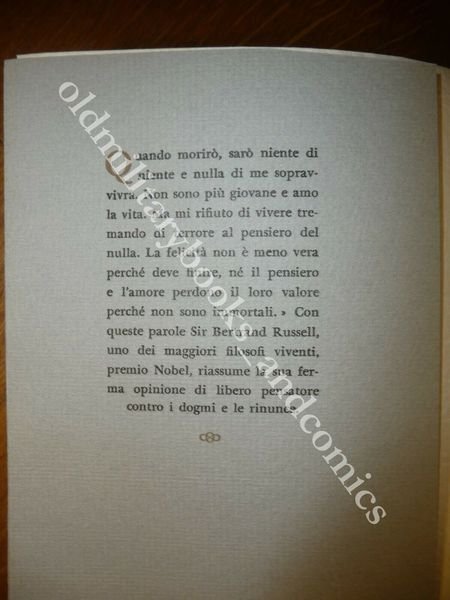 DESCRIZIONE: Longanesi & C. Milano 1960, br. ed. con sovracc. con alette, pp. 282 in 16°. Bertrand Arthur William Russell, terzo conte Russell (Trellech, 18 maggio 1872 - Penrhyndeudraeth, 2 febbraio 1970), è stato un filosofo, logico e matematico gallese. Fu anche un autorevole esponente del movimento pacifista e un divulgatore della filosofia. In molti hanno guardato a Russell come a una sorta di profeta della vita creativa e razionale; al tempo stesso la sua posizione su molte questioni fu estremamente controversa. "Perché non sono cristiano" affronta con spregiudicata libertà di pensiero un argomento di grande interesse: il sentimento religioso. Russel, pensatore ateo per eccellenza, analizza con semplicità e chiarezza di esposizioni origini, valori e significati della religione cristiana. Un testo imprescindibile per credenti e non credenti, uno dei "classici" più letti di Russell. CONDIZIONI: Ottime/Perfette. Il vecchio proprietario, un matematico, era stato Preside di Liceo, e Docente Universitario. Questo libro proviene dalla sua importante biblioteca privata, per cui alla prima bianca sono riportati i codici di catalogazione oltre all’etichetta sul dorso. PESO / WEIGHT: 300 gr. without package
