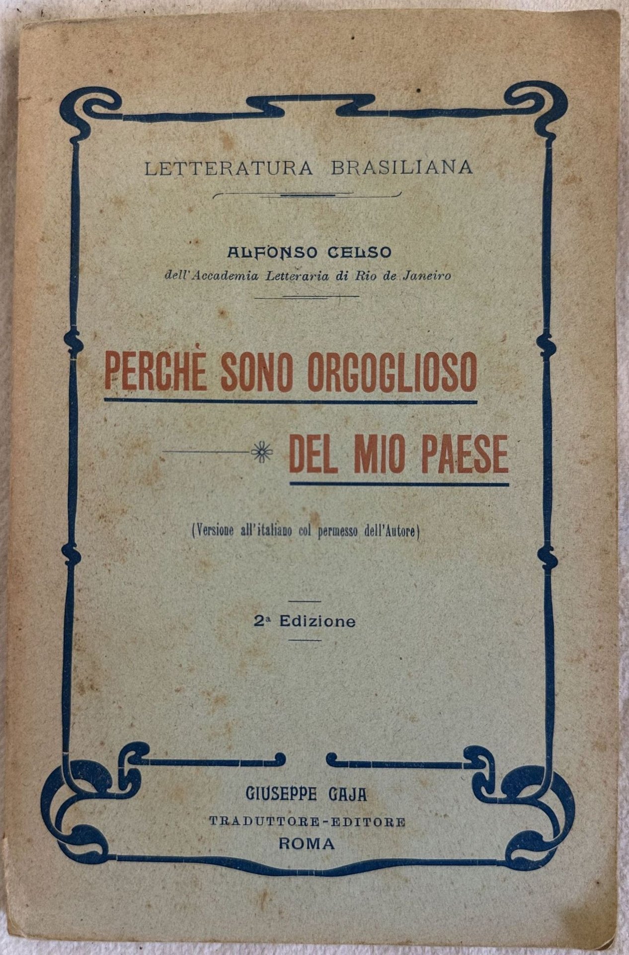 Interessante volume del 1903 sul Brasile scritto da Alfonso Celso. Traduzione dal portoghese del giornalista Giuseppe Gaja. All'interno: superiorità del Brasile per grandezza territoriale; vantaggi; fiume delle Amazzoni, Cascata di Paulo Affonso, La foresta vergine, La Baia di Rio de Janeiro, Ricchezza, Varietà del clima, Mancanza di calamità, Costumi curiosi degli indigeni del Brasile, I neri, i portoghesi, il meticcio brasiliano, Guerre dopo l'indipendenza, La battaglia di Ituzaingo, La guerra del Paraguay, storia, Esploratori, Repubblica di Palmares, Guerra olandese, Ritirata di Laguna, Indipendenza del Brasile, Don Pedro II, Schiavitù nel Brasile, i pericoli che minacciano il Brasile ec. Ritratto dell'autore. In buone condizioni. Copertina editoriale in buone condizioni generali con lievi usure ai margini e dorso. Legatura in buone condizioni. All'interno le pagine si presentano in buone condizioni con fioriture. Mancanze all'angolo superiore destro di pp. da 153 a 159. In 16. 18,5x12,5 cm. Pp. 192.Interesting volume of 1903 about Brasil written by Alfonso Celso. Translation from Portugal by Giuseppe Gaja. Inside: big lands; river of Amazzoni, Cascata di Paulo Affonso, Virgin Forest, Rio de Janeiro Bay, Richness, Variety of climate,Nice costumes of indigenous people, Black people, Portugal people, Wars after Indipendence, Battle of Ituzaingo, War of Paraguay, history, Explorers, Republic of Palmares, Dutch war, Ritirata di Laguna, indiependence of Brasil, Don Pedro II, Slavery ec. Portrait of the author. In good conditions. Editorial cover in good general conditions lightly worn in the extremities. Binding in good conditions. Pages in good conditions with foxing. Lackings in the upper right corner from p. 153 to 159. In 16. 17,5x11 cm. Pp. 268.