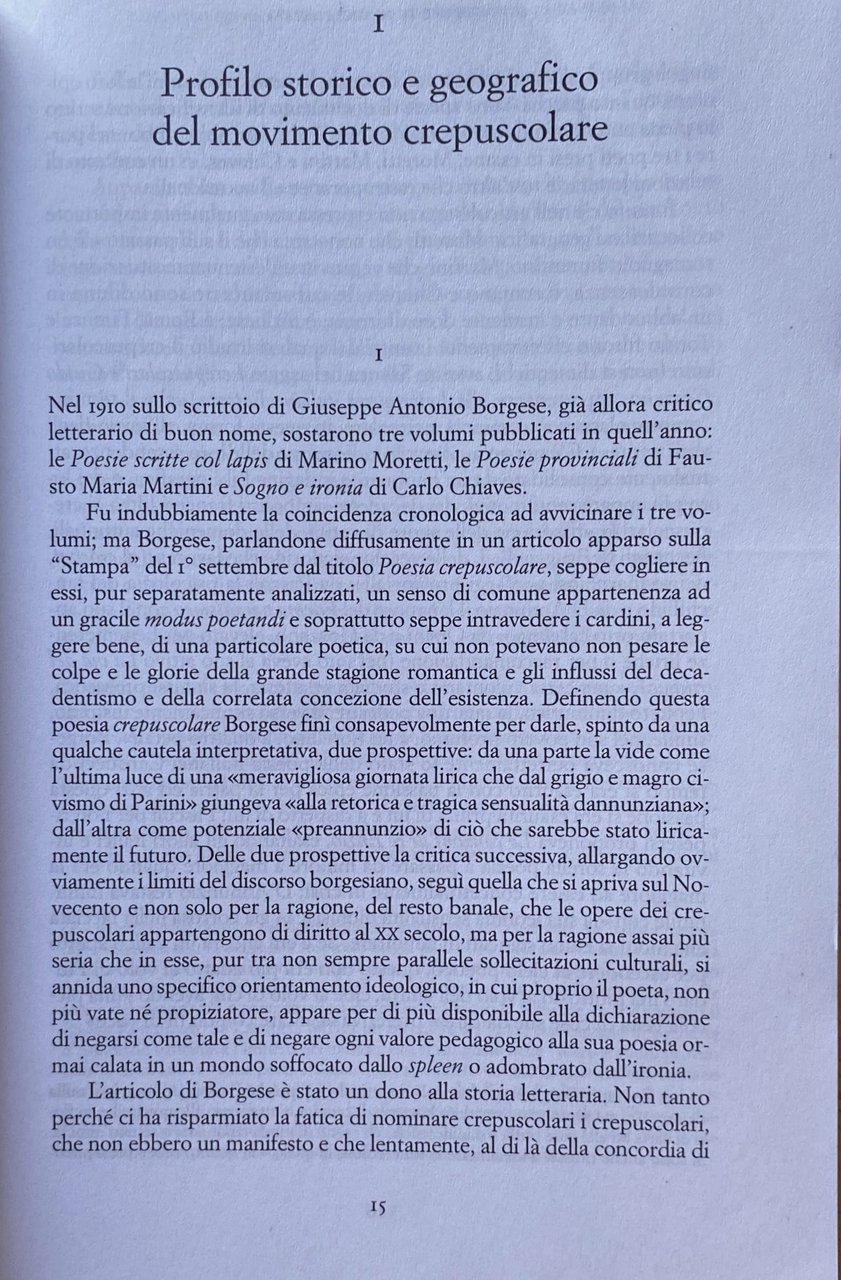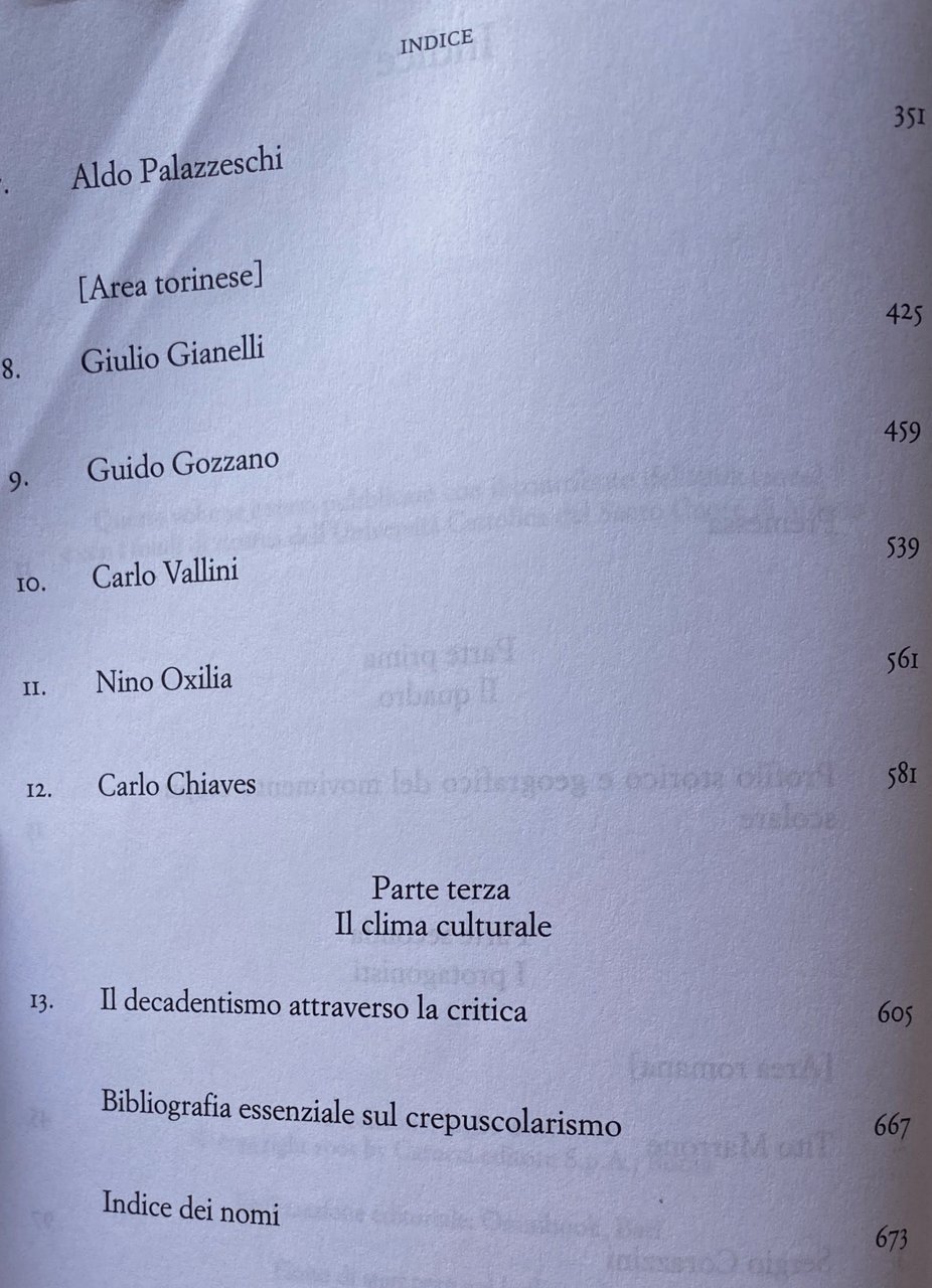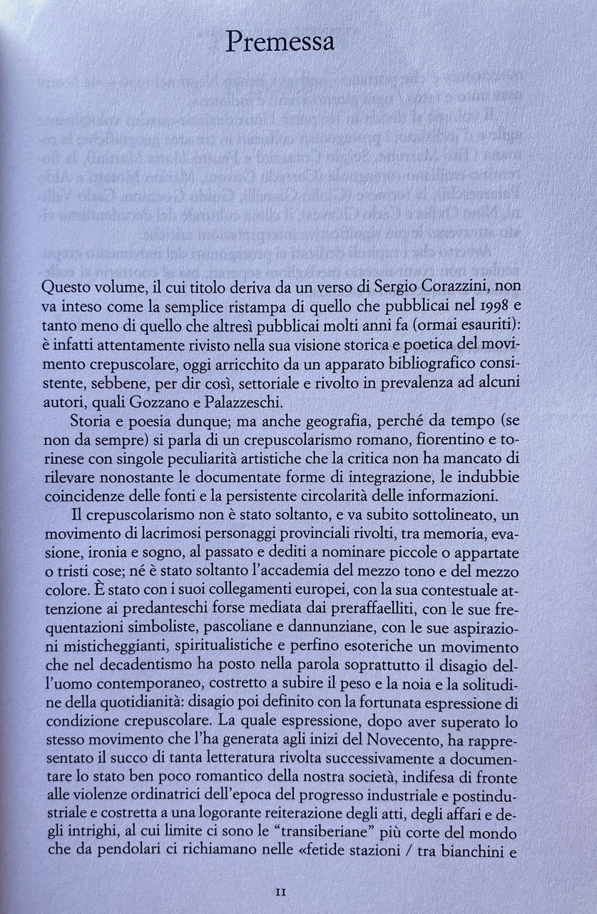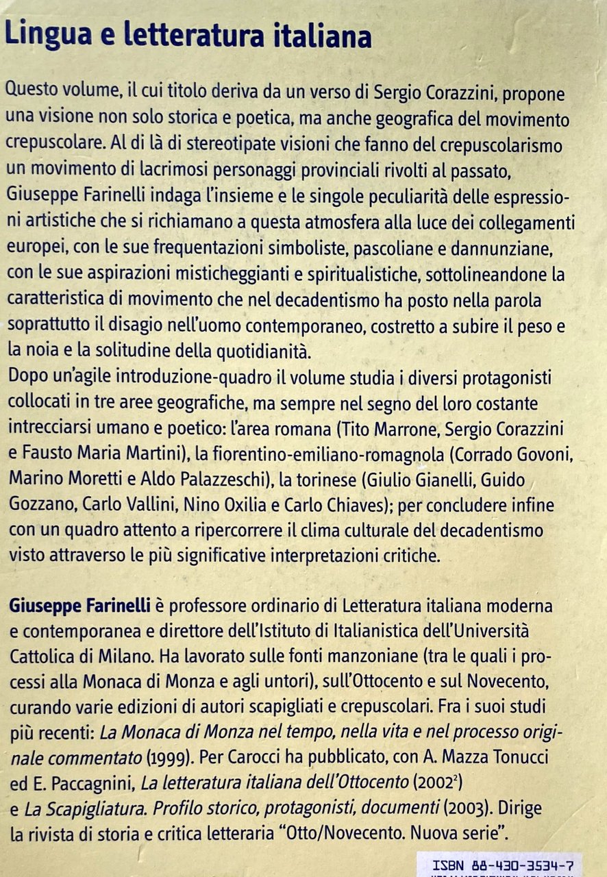 Soggetti: Poesia contemporanea, Poetica, Poesie, Letteratura, Italianistica, Decadentismo, Movimenti, Generi letterari, Critica letteraria, Crepuscolarismo, Simbolismo, Novecento, Disagio, Modernità, Cultura, Scapigliatura Solitudine Bibliografia Riferimento Sudi culturali Libri rari fuori catalogo Collezionismo Arte Linguistica Futurismo Mistica Avanguardia Avanguardie artistiche Fascismo Psicologia Psicanalisi Alberto Tarchiani Aldo Palazzeschi Allanic Borghesia Borghese Canto Carducci Cavalli bianchi Carolo Chiaves Colloquio Composizioni Corazziniana Corrado Govoni Crepuscolare Cuore Gabriele D'Annunzio Esistenzialismo Estetismo Fausto Maria Martini Fiale Fiori Firenze Francese Francis Frate rosso Giulio Gianelli Govoni Gozzaniana Graf Grigio Guglielminetti Guido Gozzano Ironia Jammes Laforgue Lessemi Lettere Lirica Livi Lucini Maeterlinck Malinconia Tommaso Marinetti Marino Moretti Martini Metrica Milano Mondo Morte Myricae Nino Oxilia Parola Giovanni Pascoli Poemi Poverazze Provincialismo Raccolte Rapporti Ricordo Rime Rodenbach Romanticismo Samain Sanguineti New York Sentimentale Sentimento Sergio Corazzini silenzio Simbolisti Crepuscolari Sintagma Sogno Sonetti Tito Marrone Torinese Torino Carlo Vallini Verso libero Macchine viventi Universo futurista Sistema culturale dominante Oggetti inutili Perfezione stilistica Teorie Materialismo vitale Ontologia Scienze umane ambientali Bruno Latour Mentalità moderna Contro-discorso Cose Liminale Tradizione Modernismo Etica Animale Antropocentrico Ardengo Soffici Arnaldo Ginna Corporeo Corpo Bruno Corra Corporee Creativo Donna Ecocritica Carne femminile Genere Ginanni Greta Gaard Ibrido Umano-non umano Identità interazione intellettuale intuizione Iovino italiano Italia Conoscenza Macchine viventi Mafarka Manifesto Maschile Marinetti Marino Moretti Mascolinità Materia Modernista Mistico Narrativa Natura Rumore Nozione Romanzo Oggetti Prospettiva Politico Relazioni Ruolo Rosà Sam Dunn Silenzio sociale Anima Spazio Simbolico Timothy Campbell Trasformazione Vallini Versi Virile Vita Virilità Donne Scrittura Danila Cannamela Angela Ida Villa Giacinto Spagnoletti Stefano Jacomuzzi Amalia Atteggiamenti Carlo Calcaterra Felicita Giardino dei frutti Prosa Scritte col lapis Strofe Tematica Tono triste Tristezza Gusto Filippo Donini Motivi Nostalgia Fanciullino Fanciullo Dolore Poemetto Piangere Farfalle Ideologia Liriche Rinascenza Irrazionalismo Fantasia Riviste Dioniso Spirito Dionisiaco Neoidealismo Nietzsche Misterico Misticismo Borgese Scipio Slataper Myricae Giuseppe Savoca Eco e Narciso Saltimbanco Palermo Saggi Boccioni De Pisis Fausto Curi Giuliana Adamo Pasquale Guaragnella Difficile Musa Officina Raccolte poetiche Antologie Male di vivere Estetica Emilio Cecchi Marzot Benedetto Croce Prezzolini Mario Praz Contemporary poetry Poetics Poems Italian literature Italianistics, Decadentism Movements Literary genres Literary criticism Crepuscularism Symbolism Twentieth century Discomfort Modernity Culture Solitude Bibliography Reference Cultural studies Rare books out of print Collecting Linguistics Futurism Mysticism Avant-garde Artistic Fascism Psychology Psychoanalysis Bourgeoisie Bourgeois Singing White horses Interview Compositions Crepuscular Heart Existentialism Aestheticism Vials Flowers Florence French Red friar Gray Irony Lexemes Letters Lyric Melancholy World Death Word Provincialism Collections Relationships Memory Rhymes Romanticism Sentimental Sentiment Silence Crepuscular Symbolists Syntagm Dream Sonnets Turin Free verse Living machines Futurist universe Dominant cultural system Useless objects Stylistic perfection Theories Vital materialism Ontology Sciences human environmental Modern mentality Counter-discourse Things Tradition Ethics Animal Anthropocentric Corporeal Body Creative Woman Ecocriticism Female flesh Gender Hybrid Human-non-human Identity Interaction Intellectual Intuition Italian Italy knowledge Living machines Male Masculinity Matter Mystical Narrative Nature Noise Notion Novel Objects Perspective Political Relationships Role Social Silence Soul Symbolic Space Transformation Verses Life Virility Women Writing Attitudes Fruit Garden Prose Written with pencil Strophe Theme Sad Tone Sadness Taste Motifs Child Pain Crying Butterflies Ideology Lyrics Renaissance Irrationalism Fantasy Magazines Dionysus Dionysian Spirit Neoidealism Mysterious Mysticism Narcissus Acrobat Essays Difficult Muse Officina Rhymes Poetry Anthologies Evil of living Aesthetics Collectibles Collectable