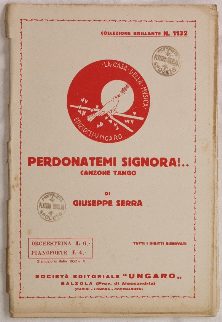 In 8. cm 27x18. pp 17. partitura completa per orchestra del 1932 di una canzone.<BR>Caratteristica copertina illustrata d'epoca. ex libris in copertina. In buone condizioni, usure al dorso e fioriture. a complete score for orchestra of 1932. Carachteristic decorated cover of that period. ex libris in the cover. In good conditions; worn spine and foxings.