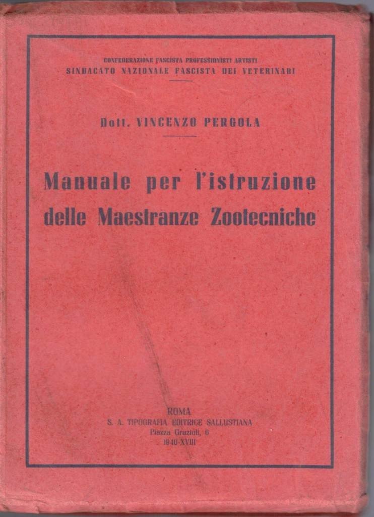 Vincenzo Pergola, Manuale per l’istruzione delle Maestranze Zootecniche, S. A. Tipografia Editrice Sallustiana, Roma 1940 XVIII, pp. VIII, 235, cm 20, br. ed. In testa al frontespizio, timbro: Confederazione Fascista Professionisti Artisti – Sindacato Nazionale Fascista dei Veterinari. Al dorso, piccolo timbro con numero progressivo di classificazione. Al frontespizio, numero progressivo di classificazione e vecchio timbo di istituto scolastico. Minime abrasioni al dorso, lievissima brunitura della carta, per il resto ottimo.