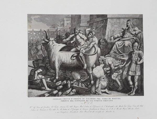 Cm.32,2x44,6 + didascalia, dedicatoria e margini. Bella ed animatissima scena raffigurante il fonditore Perillo costretto ad immolarsi, per ordine del tiranno di Siracusa Falaride, nel cavallo di bronzo che lui stesso aveva inventato per bruciare vivi i condannati a morte. Pregevole incisione con dedicatoria a S. E. Don Carlo Avarno duca di Valguarnera. Nitido ed ottimo esemplare. Si unisce il foglio descrittivo dell'evento, in italiano e francese, che solitamente si applicava dietro la stampa incorniciata.