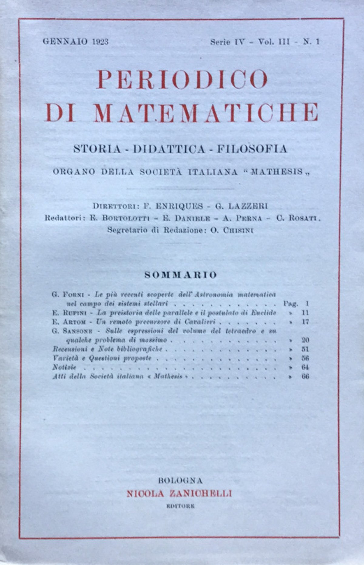Gennaio 1923 Organo della Società italiana Mathesis. Direttori: F. enriques, G. Lazzeri. Redattori: E. Bortolotti, E. Daniele, A. Perna, C. Rosati. 510 - Ba In Ottavi (15-23cm ) Ottimo (Fine) Ottimo