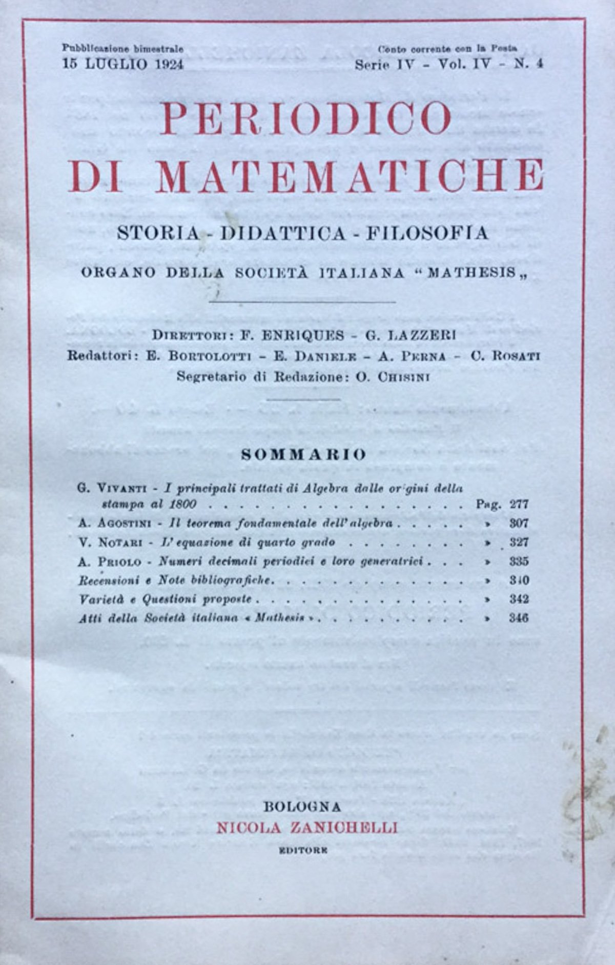 Periodico di matematiche. Storia - Didattica - Filosofia Luglio 1924