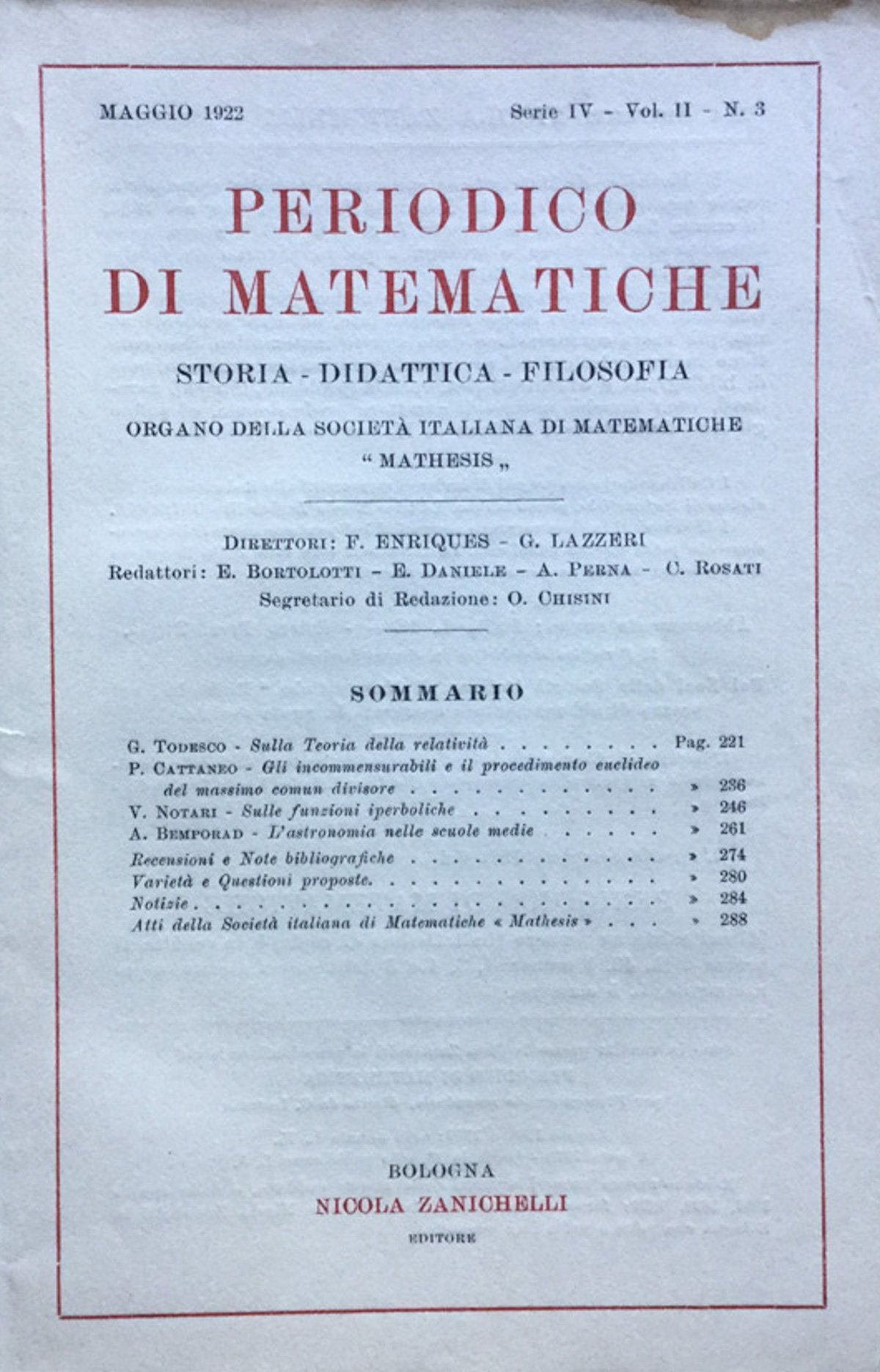 Maggio 1922 Organo della Società italiana Mathesis. Direttori: F. enriques, G. Lazzeri. Redattori: E. Bortolotti, E. Daniele, A. Perna, C. Rosati. 510 - Ba In Ottavi (15-23cm ) Ottimo (Fine) Ottimo
