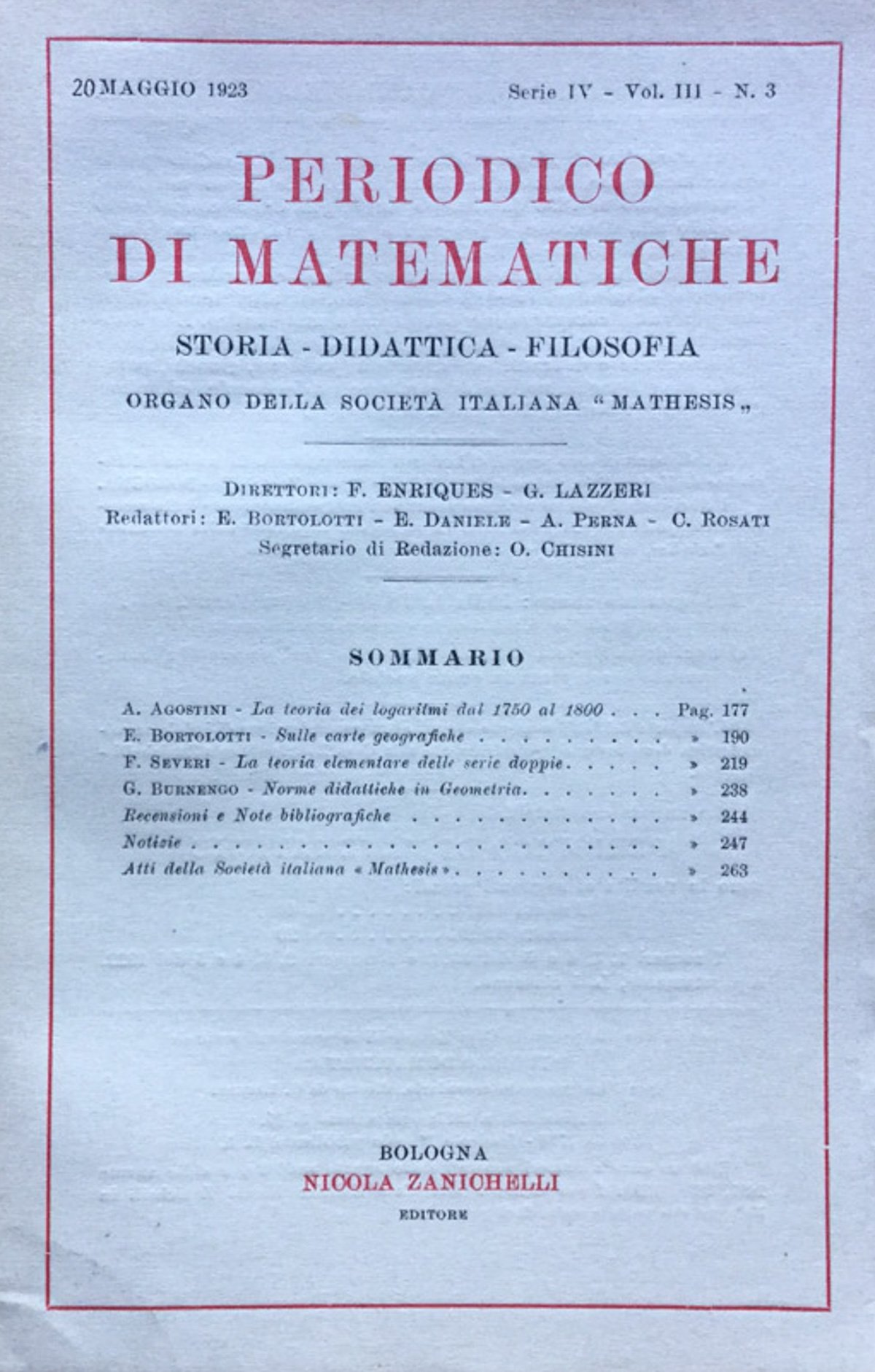 Maggio 1923 Organo della Società italiana Mathesis. Direttori: F. enriques, G. Lazzeri. Redattori: E. Bortolotti, E. Daniele, A. Perna, C. Rosati. 510 - Ba In Ottavi (15-23cm ) Ottimo (Fine) Ottimo