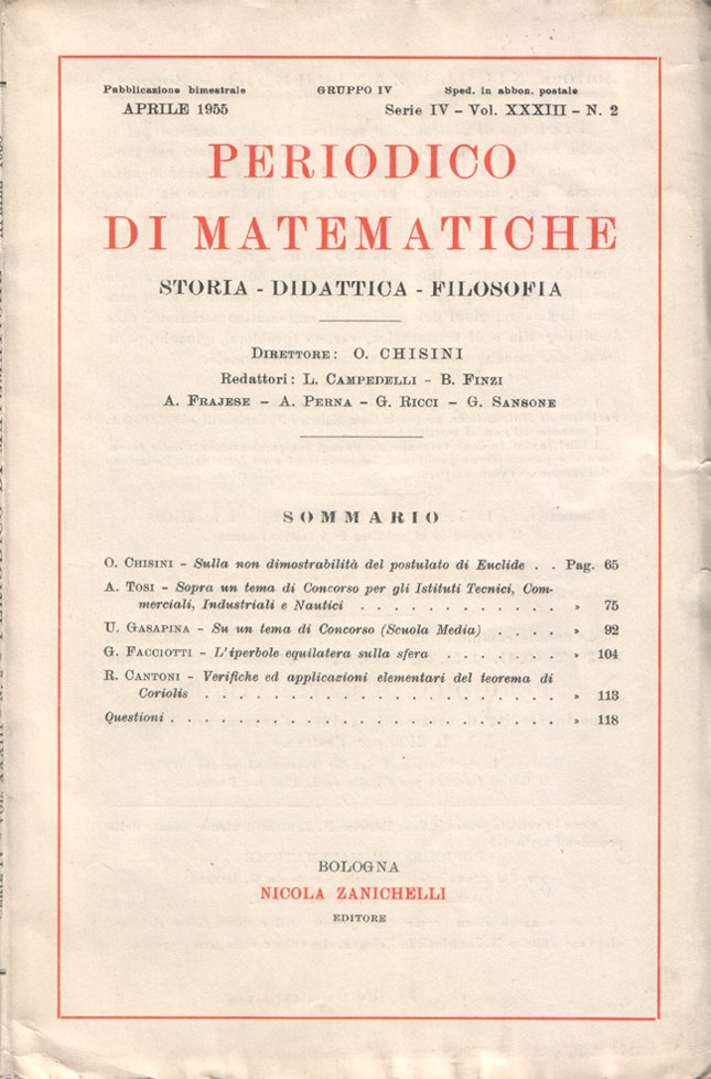 In-8°, pp. da 65 a 128, copertina editoriale. In buono stato. Sommario: O. Chisini, Sulla non dimostrabilità del postulato di Euclide; Armida Tosi, Sopra un tema di Concorso per gli Istituti Tecnici, Commerciali, Industriali e Nautici; Umberto Gasapina, Su un tema di concorso (scuola media); Guido Facciotti, L'iperbole equilatera sulla sfera; Riccardo Cantoni, Verifiche ed applicazioni elementari del teorema di Coriolis; Questioni.