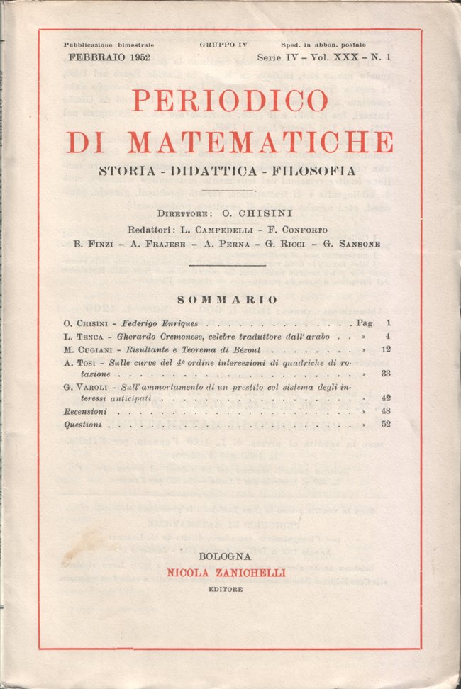 Periodico di matematiche. Storia - Didattica - Filosofia. Pubblicazione bimestrale. Febbraio 1952 - Serie IV - Vol. XXX - N. 1