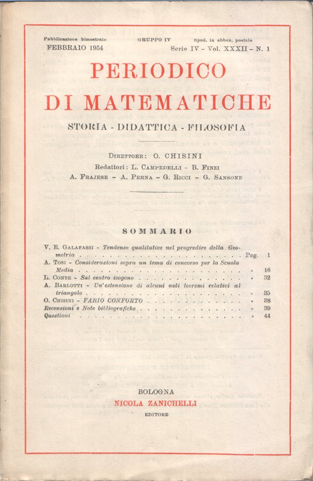 In-8°, pp. 56, copertina editoriale. In buono stato. Sommario: Vittorio Emanuele Galafassi, Tendenze qualitative nel progredire della Geometria, Armida Tosi, Considerazioni sopra un tema di concorso per la Scuola Media; Luigi Conte, Sul centro isogono; Adriano Barlotti, Un'estensione di alcuni noti teoremi relativi al triangolo; Oscar Chisini, Necrologio di Fabio Conforto; L. Caprioli, Recensioni e note bibliografiche; Questioni.