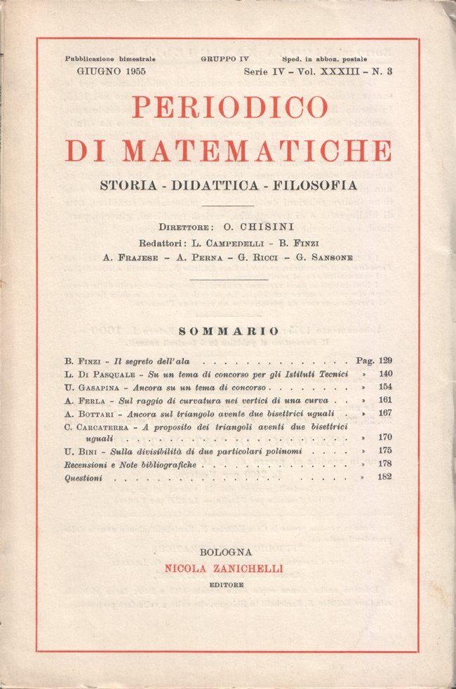 In-8°, pp. da 129 a 192, copertina editoriale. In buono stato. Sommario: Bruno Finzi, Il segreto dell'ala; Luigi Di Pasquale, Su un tema di concorso per gli Istituti Tecnici; Umberto Gasapina, Ancora su un tema di concorso (rettifica e commento alla nostra soluzione); Ambrogio Ferla, Sul raggio di curvatura nei vertici di una curva; Amerigo Bottari, Ancora sul triangolo avente due bisettrici uguali; Cesare Carcaterra, A proposito dei triangoli aventi due bisettrici uguali; Umberto Bini, Sulla divisibilità di due particolari polinomi; Otto Cuzzer, Recensioni e note bibliografiche; Questioni.