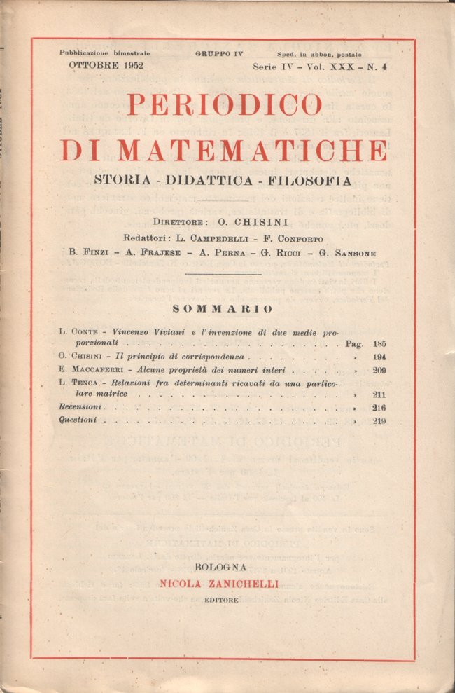 Periodico di matematiche. Storia - Didattica - Filosofia. Pubblicazione bimestrale. Ottobre 1952 - Serie IV - Vol. XXX - N. 4