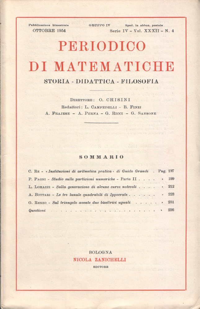 In-8°, pp. da 197 a 260, copertina editoriale. In buono stato. Sommario: Catterina Re, "Istituzioni di aritmetica pratica" di Guido Grandi (Edito a Firenze nel 1740); Plinio Pagni, Studio sulle partizioni numeriche - Parte II (continuazione dell'articolo pubblicato sul n. 3 - 1954); Luigi Lomazzi, Sulla generazione di alcune curve notevoli; Amerigo Bottari, Le tre lunule quadrabili di Ippocrate, Gregorio Renzo, Sul triangolo avente due bisettrici uguali; Questioni.
