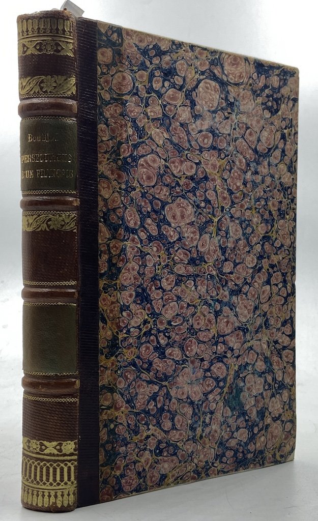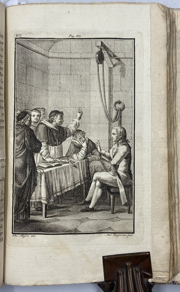 Rilegatura ottocentesca in mezza pelle a cinque nervi con piatti marmorizzati (remboîtage, tassello rifatto), 8vo cm14.5x22, pp (2) VII (1) 71 (1), VIII 65-175 (1); sette tavole incise. Segnatura: π1 a6 A-D4 π8 E-L8. Remboîtage moderno in legatura ottocentesca; sulle prime carte (12 carte e prima tavola) restauro con integrazione di lacuna sul margine esterno; carte generalmente brunite, alcune marginali noterelle d’antica mano, lievi gore sul margine superiore dell’ultima segnatura. Errori nella numerazione delle pagine, e in questo esemplare le due carte di Sommaire, numerate III-VII, sono frapposte a quelle di Introduction. Discreto esemplare, completo e in barbe ma con qualche difetto. Resoconto di prima mano delle disavventure dell’autore, commerciante di stoffe coinvolto suo malgrado nella bancarotta fraudolenta di un socio d’affari a Genova e quindi incarcerato ingiustamente. L’opera, pubblicata subito dopo la caduta del sistema dogale all’alba della giacobina Repubblica Ligure, denuncia ampiamente la corruzione del governo oligarchico genovese, che vide l’autore più volte incarcerato ingiustamente per la compiacenza portata dai funzionari ai suoi nemici; imprigionato alla Malapaga, al Palazzetto e a San Domenico, Bouillod dovette fronteggiare il tribunale civile che l’accusò di sedizione “in quanto imprudente parlatore antiolgarchico" (Arato, p. 112) e l’Inquisizione che lo sospettava frammassone; prezioso e più volte ricordato nel testo l’aiuto portato all’autore dal commerciante svizzero residente in Genova Jean Georges Honnerlag, fondatore del cimitero protestante della città. Non comune edizione originale, illustrata da sette rami incisi da Antonio Rogerone d’après Luigi Gardella e Filippo Alessio; la prima tavola è una veduta marina di due velieri, con la Lanterna sullo sfondo. [Manno 23279; Thory ACTA LATOMORUM 272] ******* XIX century binding (remboitage), some repairs on the margins of first 12 leaves and first plate, a fair copy, complete and deckled edged, but definitely showing its age. An uncommon account of the unjust imprisonment the author suffered in Genoa, after being falsely accused of fraudulent bankruptcy and having his enemies corrupted the officials of the oligarchic government; during his troubles he encountered the Inquisitions, suspecting him to be a Freemason.