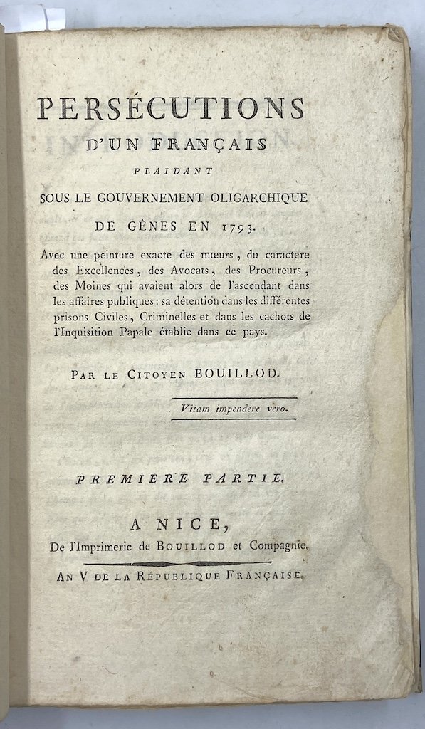 PÉRSECUTIONS D’UN FRANÇAIS PLAIDANT SOUS LE GOUVERNEMENT OLIGARCHIQUE DE GÉNES EN 1793. Avec une peinture exacte des moeurs, du caractère des Excellences, des Avocats, des Procureurs, des Moines qui avaient alors de l’ascendant dans les affaires publiques: sa détention dans les différentes prisons Civiles, Criminelles et dan le cachots de l’Inquisition Papale établie dans ce pays. PAR LE CITOYEN BOUILLOD. PREMIERE PARTIE (-SECONDE). A NICE, de l’Imprimerie BOUILLOD et Compagnie. An V de la République Française. [1797]