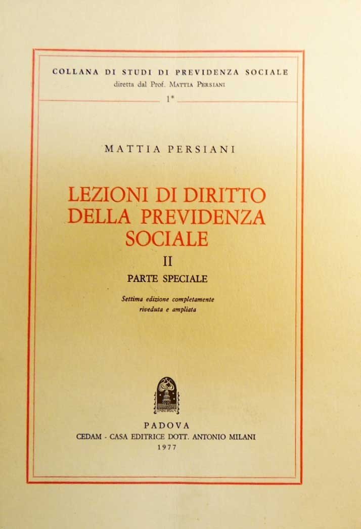 Mattia Persiani, Lezioni di diritto della previdenza sociale. II: Parte speciale, Cedam, Padova 1977, settima ed. completamente riveduta e ampliata, pp. 153, cm 25, br. ed. Collana di studi di previdenza sociale, n. 1. Ben conservato.