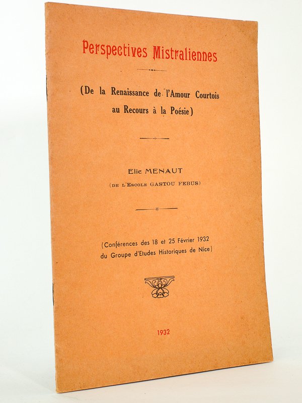 Perspectives mistraliennes. ( De la Renaissance de l'Amour Courtois au Recours à la Poésie ) -Conférences des 18 et 25 février 1932 du Groupe d'Etudes Historiques de Nice [ exemplaire dédicacé par l'auteur ]