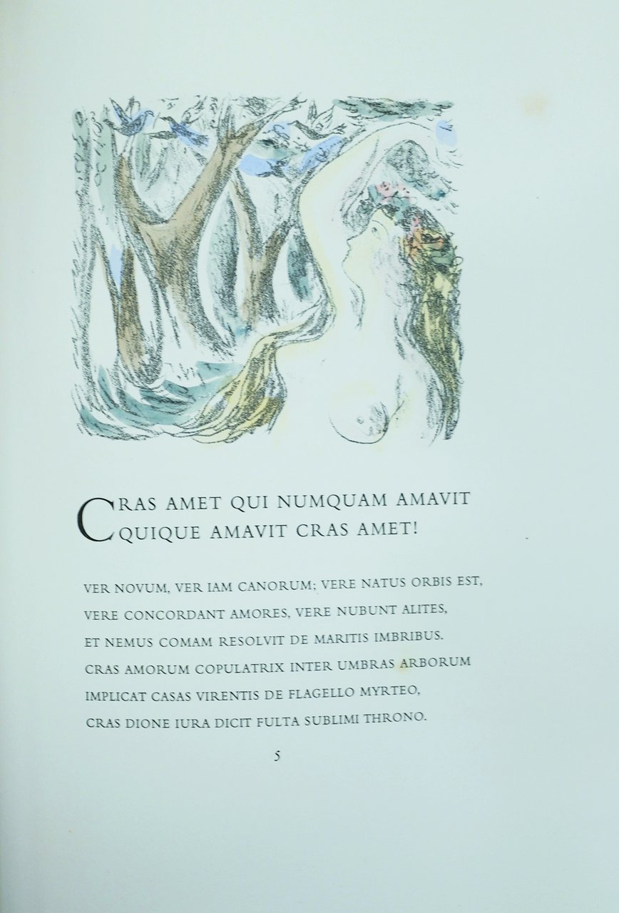 In-4 p., legatura edit. in cartonato avorio, marchio dell'editore Hoepli in oro al piatto, astuccio avorio (tracce di polvere), pp. 42. Versi nel latino del II secolo d.C., seguiti dalla traduzione e da una nota di Alessandro Cutolo, con 5 litografie (nel testo) disegnate e acquarellate di Mario Vellani Marchi. Cfr. Cat. Mardersteig,109. Edizione stampata per la "Libreria Antiquaria Hoepli", Milano. Tiratura di 165 esemplare numerati, su carta a tino Magnani. Il ns., 109, è in ottimo stato.