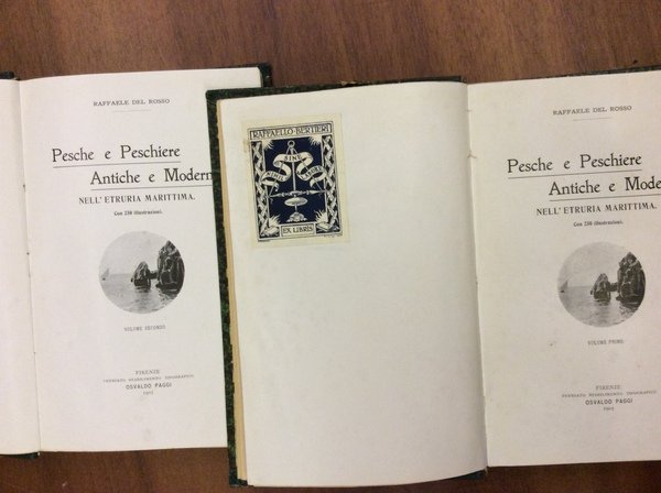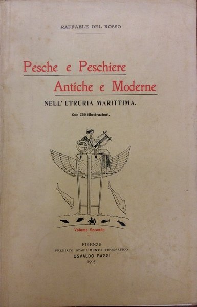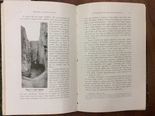 In-8 p., 2 volumi, mz. tela coeva, conserv. brossura orig., pp. 2,XXXI,287; 764,(2) (numeraz. continua); molto ben illustr. in bianco e nero nel testo da 250 immagini (foto e disegni) e da 9 tavole fuori testo Le grandi peschiere perdute (la tonnara di Cosa - le cetarie domiziane - la mattanza di P. S. Stefano) // Le peschiere etrusche alla Tagliata dell'Ansedonia; La villa dei Domizi Enobarbi sull'Argentario; Il bagno del Saraceno all'isola del Giglio; I vivai di Fulvio Irpino alla foce della Marta; La villa di Clodio e le peschiere sul lago Prile; La peschiera di Falesia; La peschiera degli abati e dei conti sulla Fiora; Le peschiere di Cosa e i vivai salsi a Orbetello; Le peschiere di Bolsena e della Mesola; Giannutri: le sue ville - le sue pesche etc..Solo alcune pagg. con sottolineature a penna, altrimenti esemplare pressochè intonso e molto ben conservato.